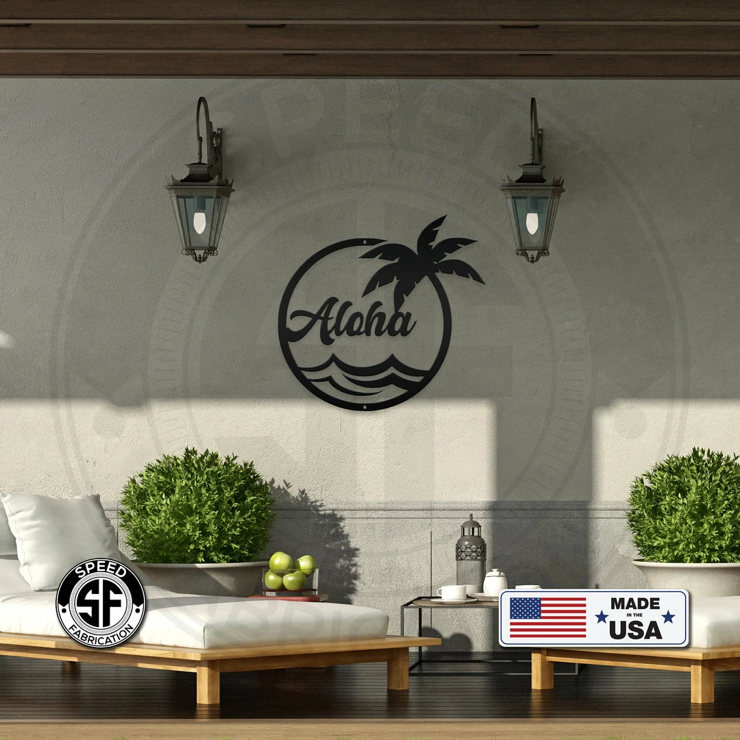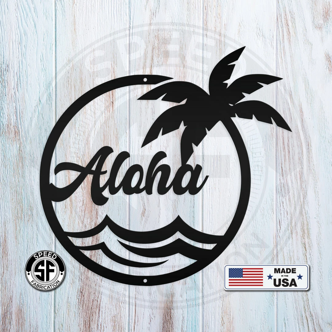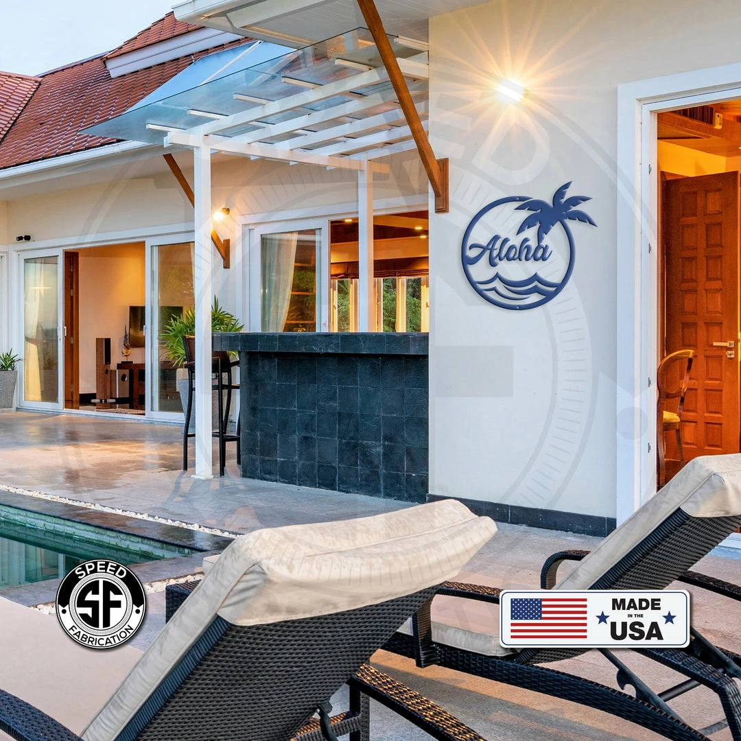 This Aloha Palm Tree Round Metal Sign is the perfect sign for your backyard pool area. Our 12″ through 28″ signs are made from 16 gauge steel, 30″ through 36″ signs are made from 14 gauge steel with a powder coated finish for a long lasting sign indoors or outdoors. Sizing is for the width of the sign.