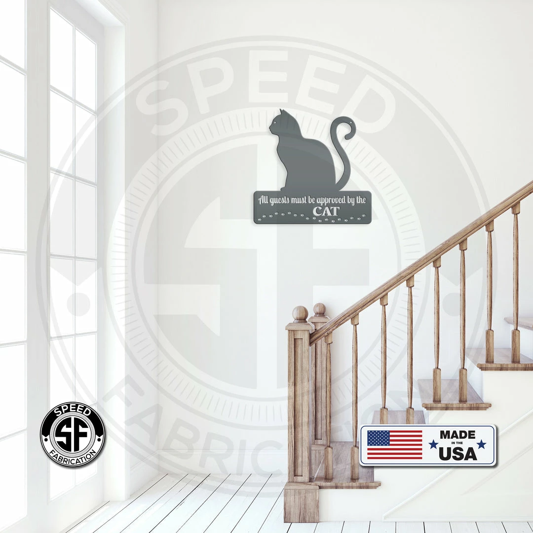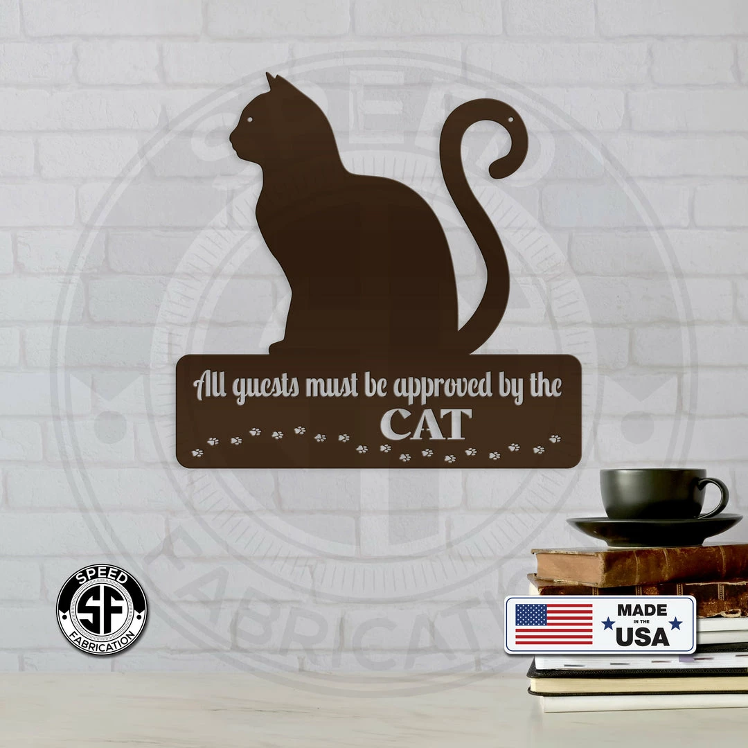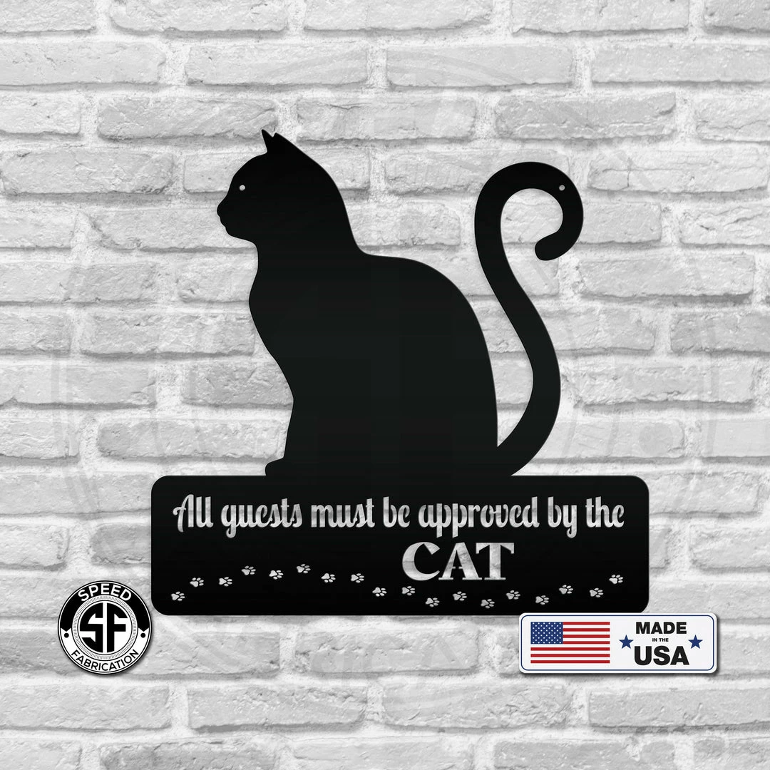 This All Guests Must Be Approved by the Cat Metal Sign is the perfect decor for any cat lover’s home. Our 12″ through 28″ signs are made from 16-gauge steel, 30″ through 36″ signs are made from 14-gauge steel with a powder coated finish for a long-lasting sign indoors or outdoors.