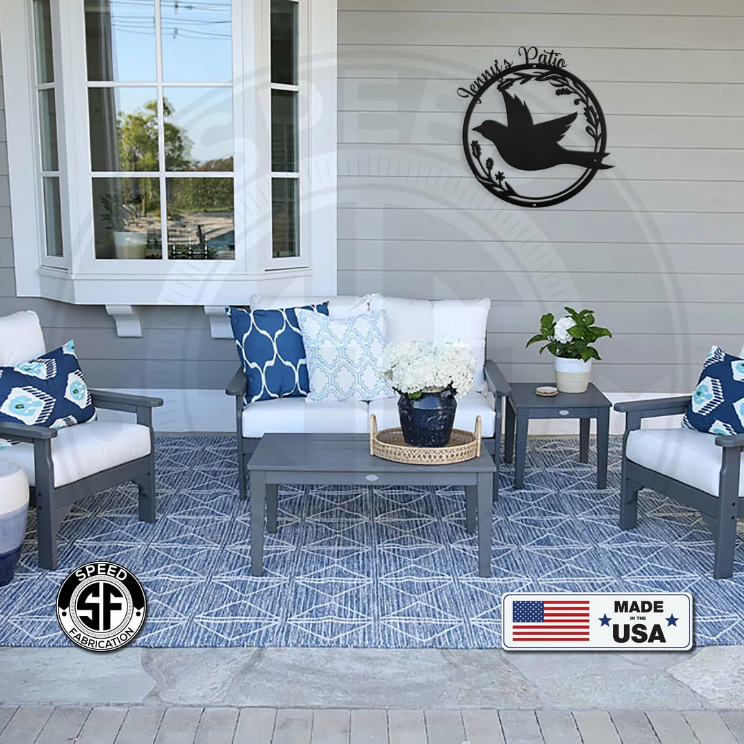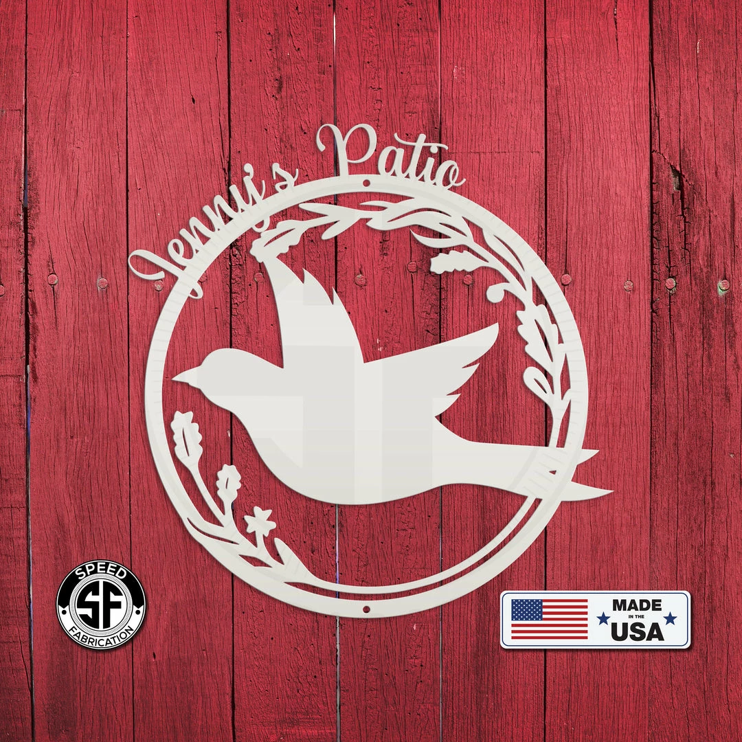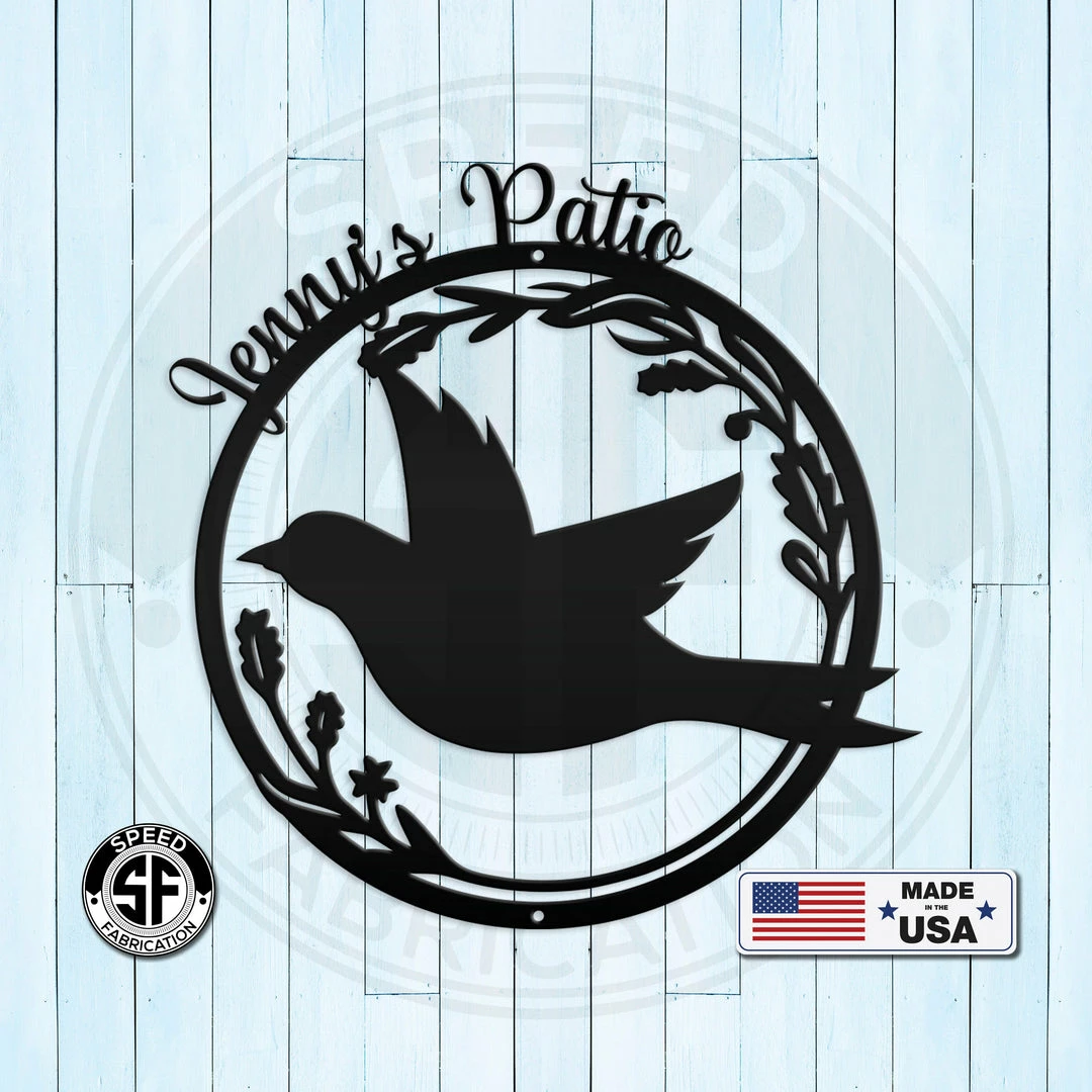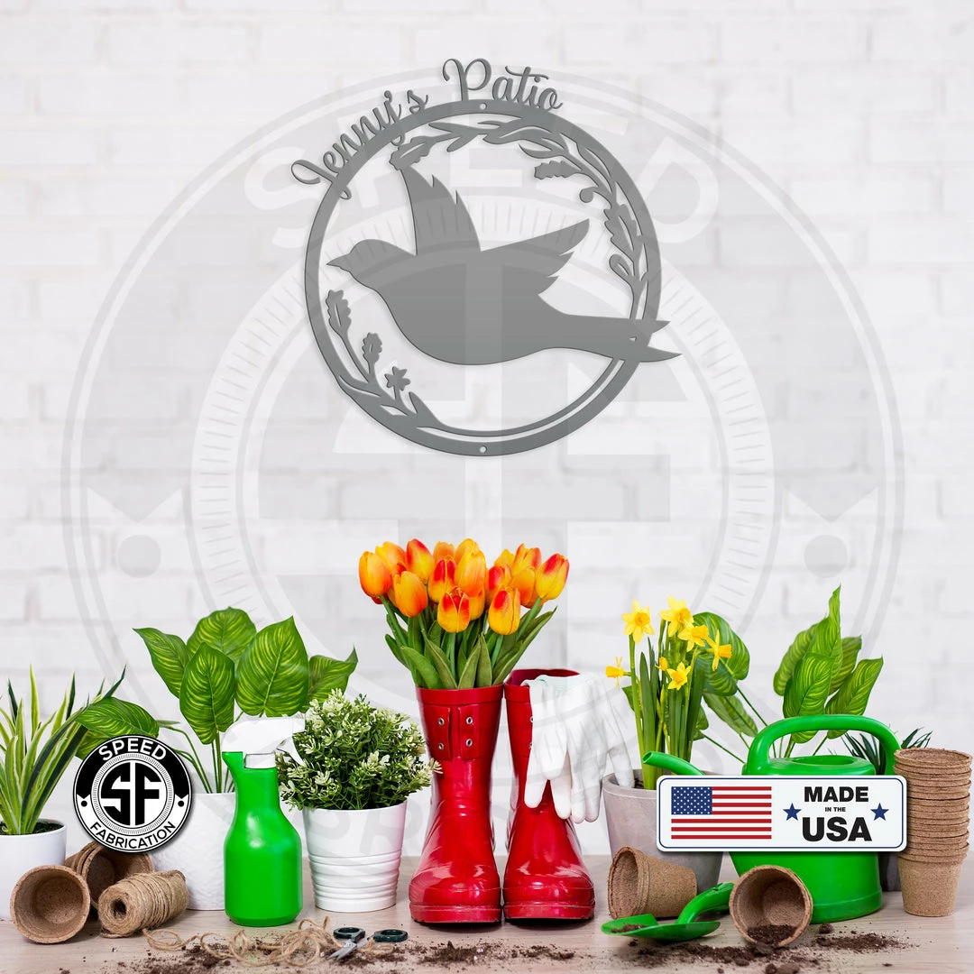 This Personalized Patio/Porch/Garden Flying Bird in Flower Frame Metal Sign is the perfect dรฉcor for any home. Makes a great Mother’s Day gift or any gift in general. Sizing is for the height of the sign. Our 5″ through 28″ signs are made from 16-gauge steel, 30″ through 36″ signs are made from 14-gauge steel with a powder coated finish for a long-lasting sign indoors or outdoors.