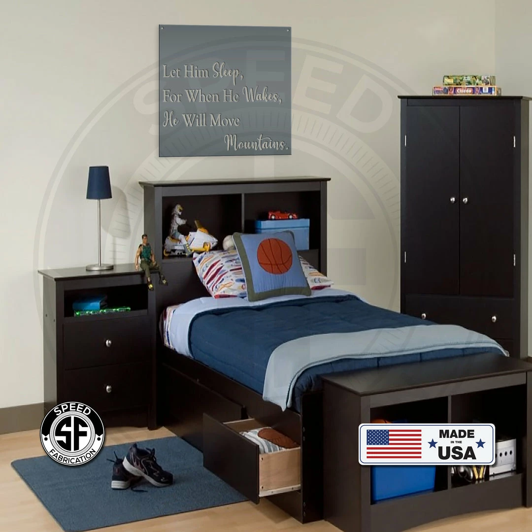 This Let Him Sleep, For When He Wakes He Will Move Mountains Metal Sign is the perfect dΓ©cor for your little boy’s room. Our 12″ through 28″ signs are made from 16 gauge steel, 30″ through 36″ signs are made from 14 gauge steel with a powder coated finish for a long lasting sign indoors or outdoors.