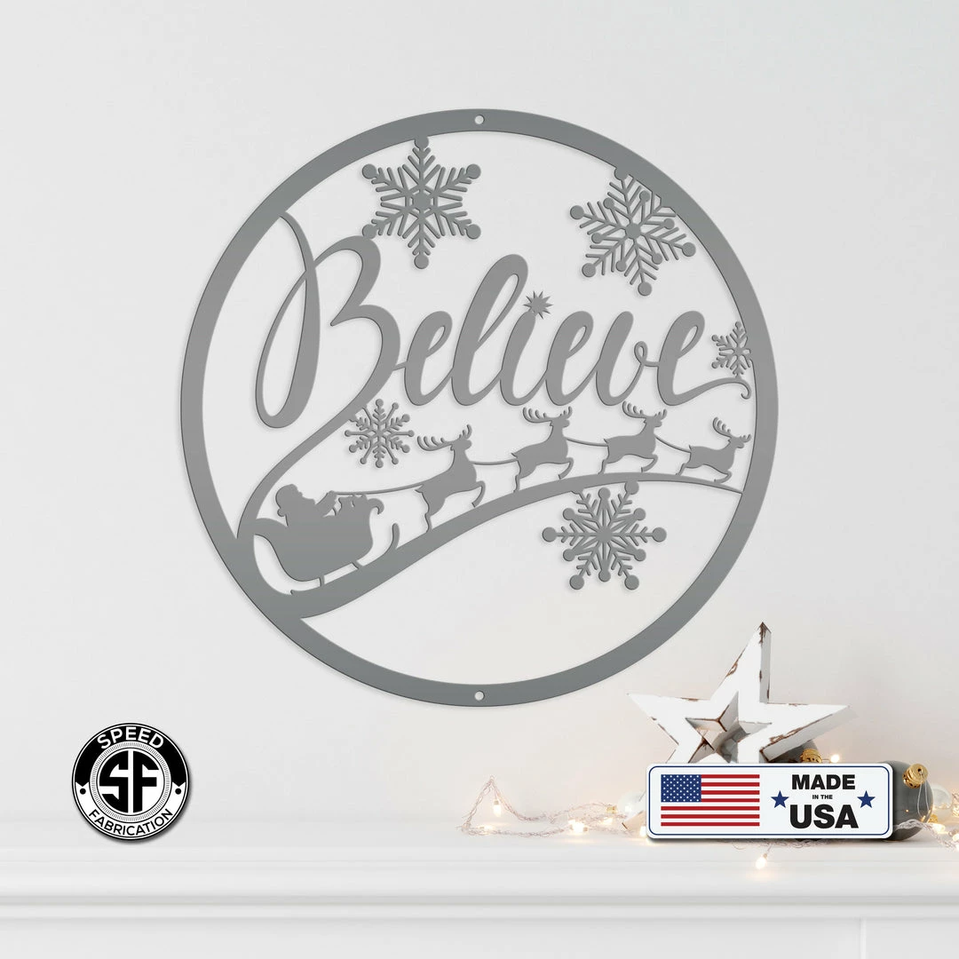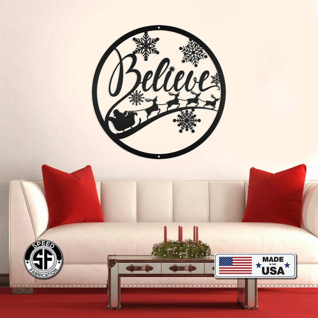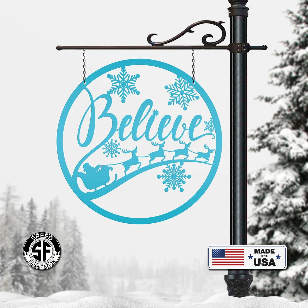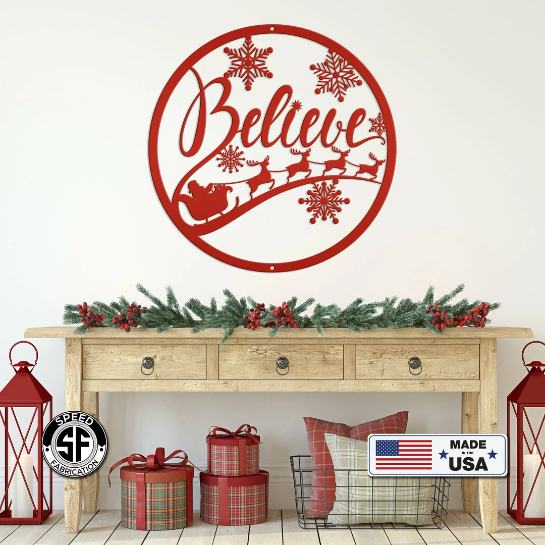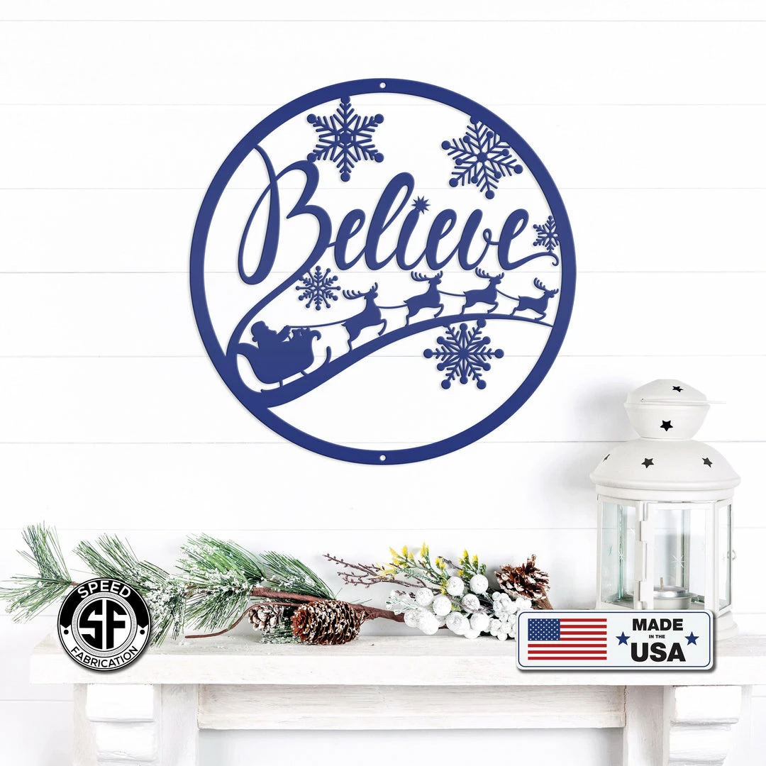 Our Believe Christmas Metal Sign is the perfect Holiday decor for your home. Hang on your front door, or on a sign hanger in your yard. Hanging holes placed at the top and bottom of sign unless requested differently in the notes to seller.