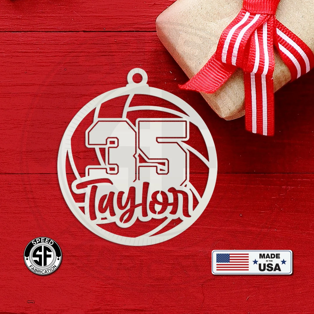 This Personalized Volleyball and Number Metal Christmas Ornament is the perfect way to deck your halls for the holidays. Makes a great gift or stocking stuffer. Made from steel and a powder coated finish or left in a bare metal finish that will rust when exposed to humidity. This ornament measures 4″ tall and does NOT include a ribbon or cord for hanging.