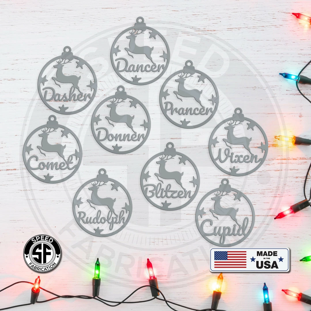 Our Santa’s Reindeer Metal Christmas Ornaments are the perfect way to deck your halls for the holidays. Available individually or as a set of 9. Made from steel with a powder coated finish or left in a bare metal finish that will rust when exposed to humidity. These ornaments measure 4″ tall and do NOT include a ribbon or cord for hanging.
