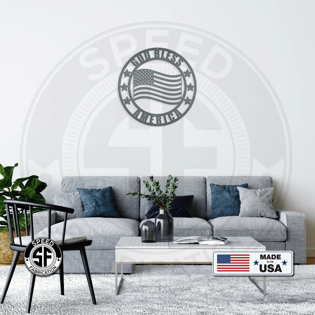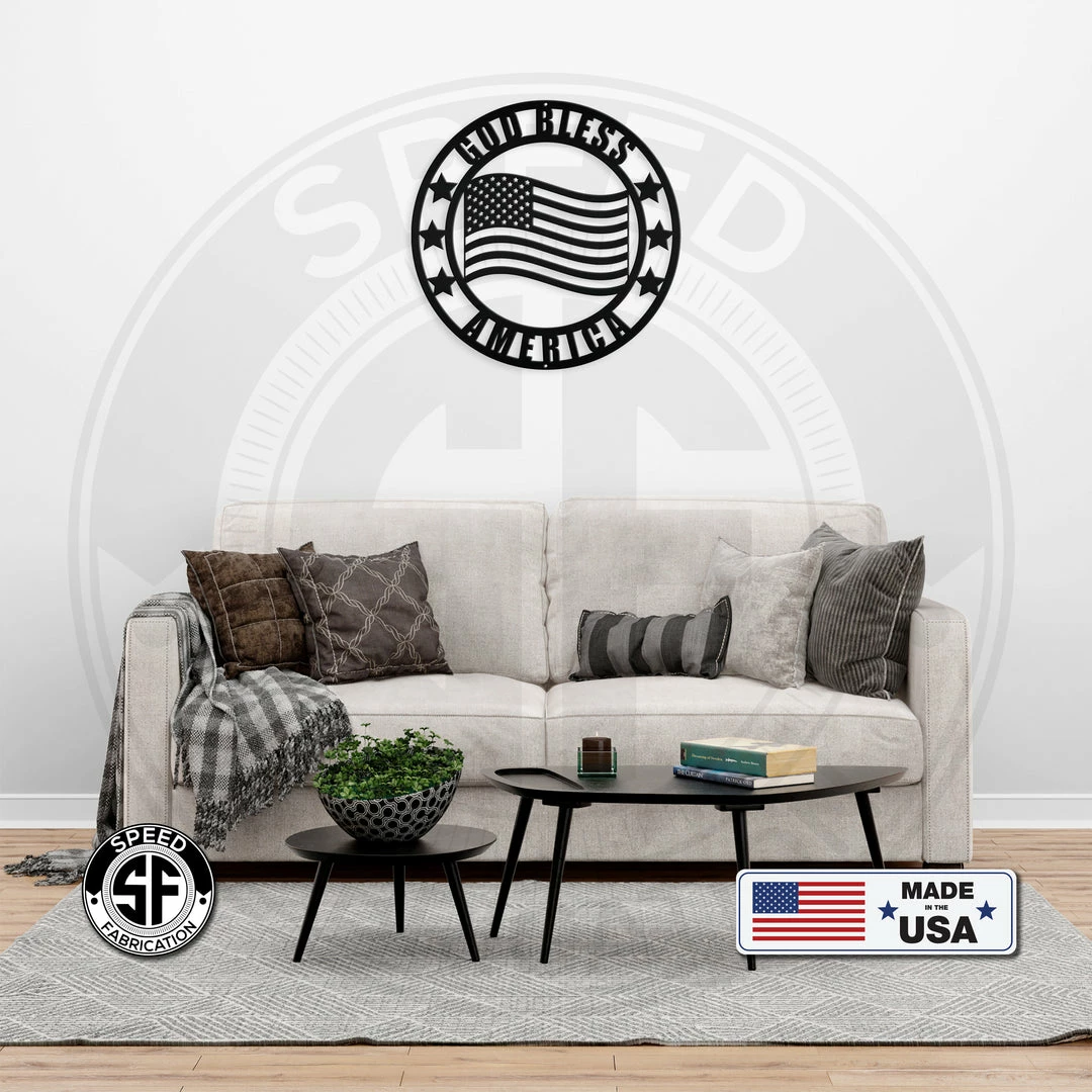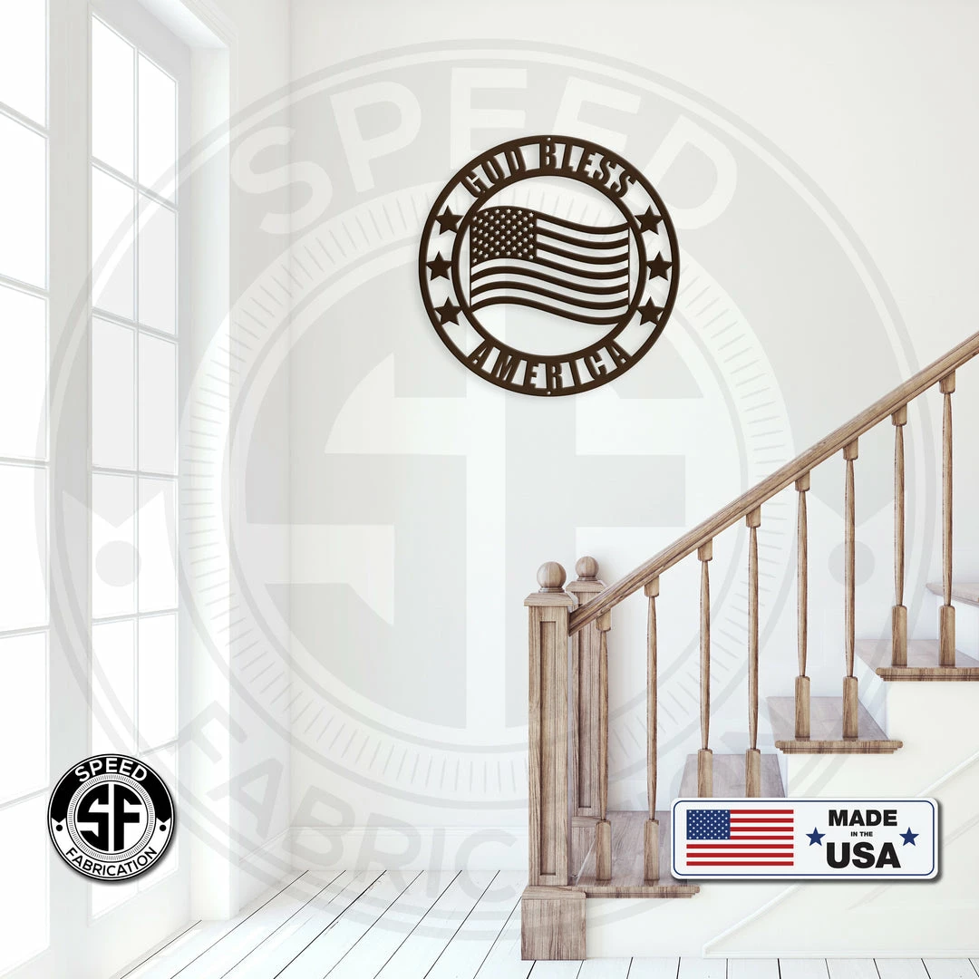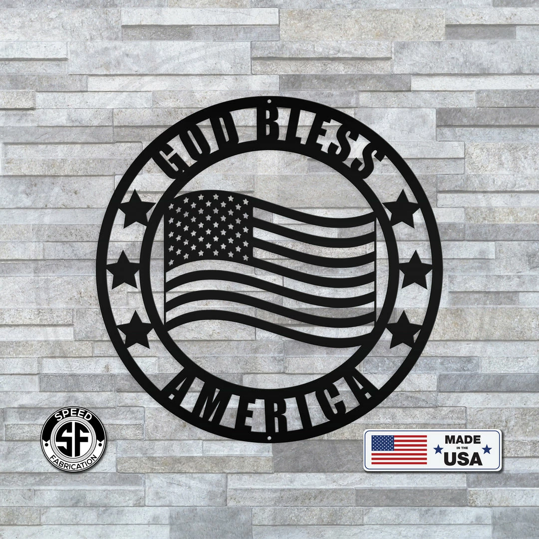 This American Flag God Bless America Metal Sign is the perfect decor for any home. Our 12″ through 28″ signs are made from 16 gauge steel, 30″ through 36″ signs are made from 14 gauge steel with a powdercoated finish for a long lasting sign indoors or outdoors.