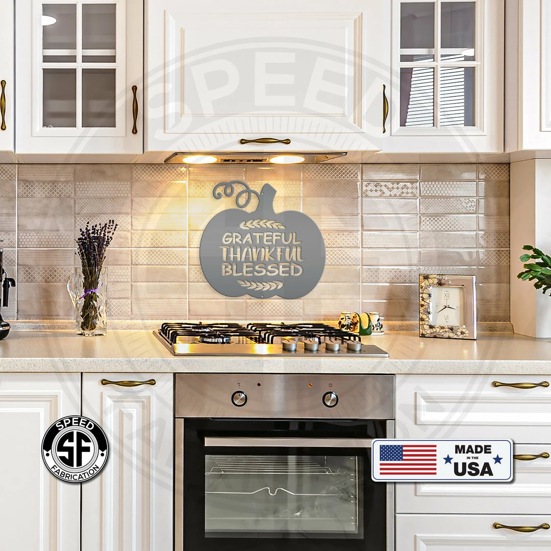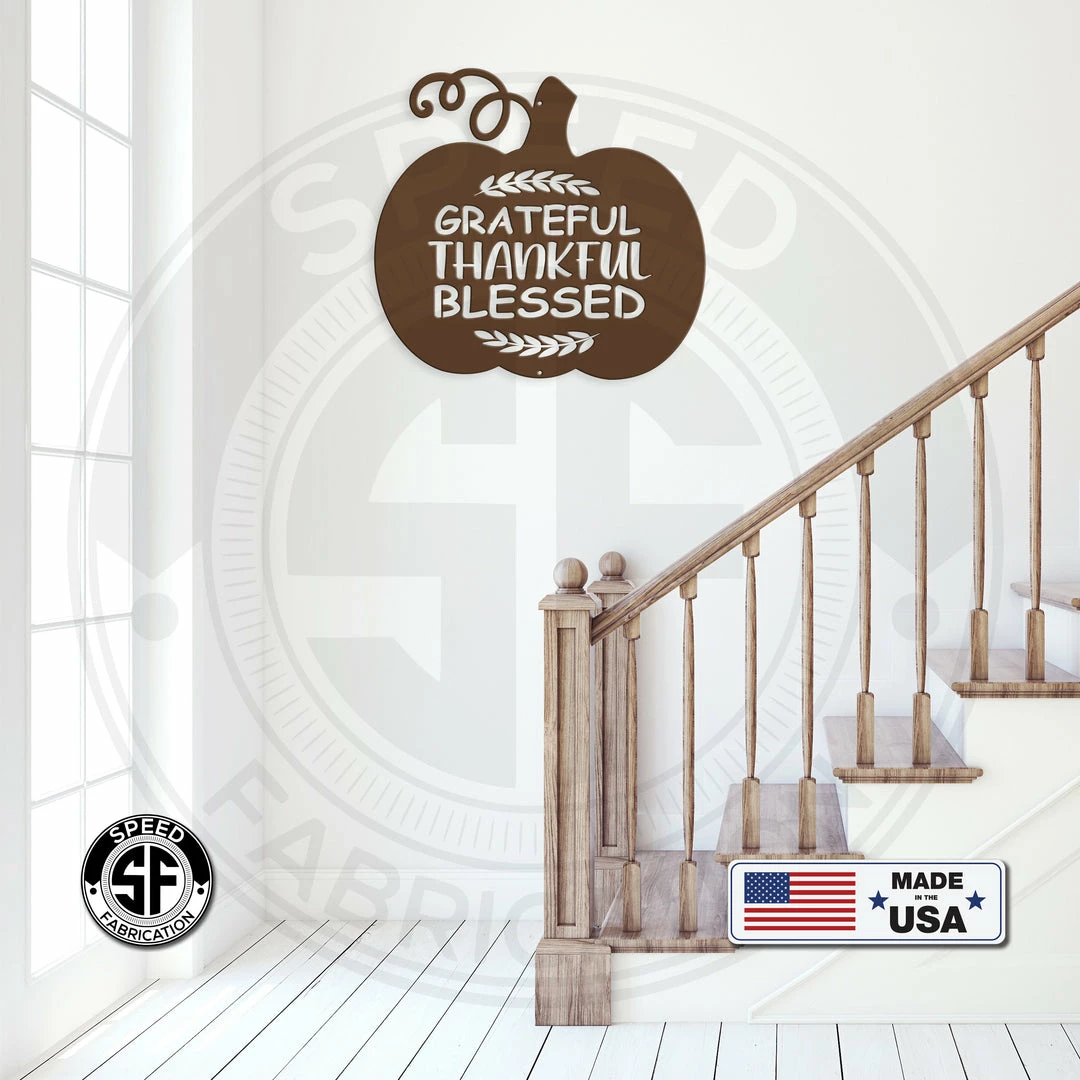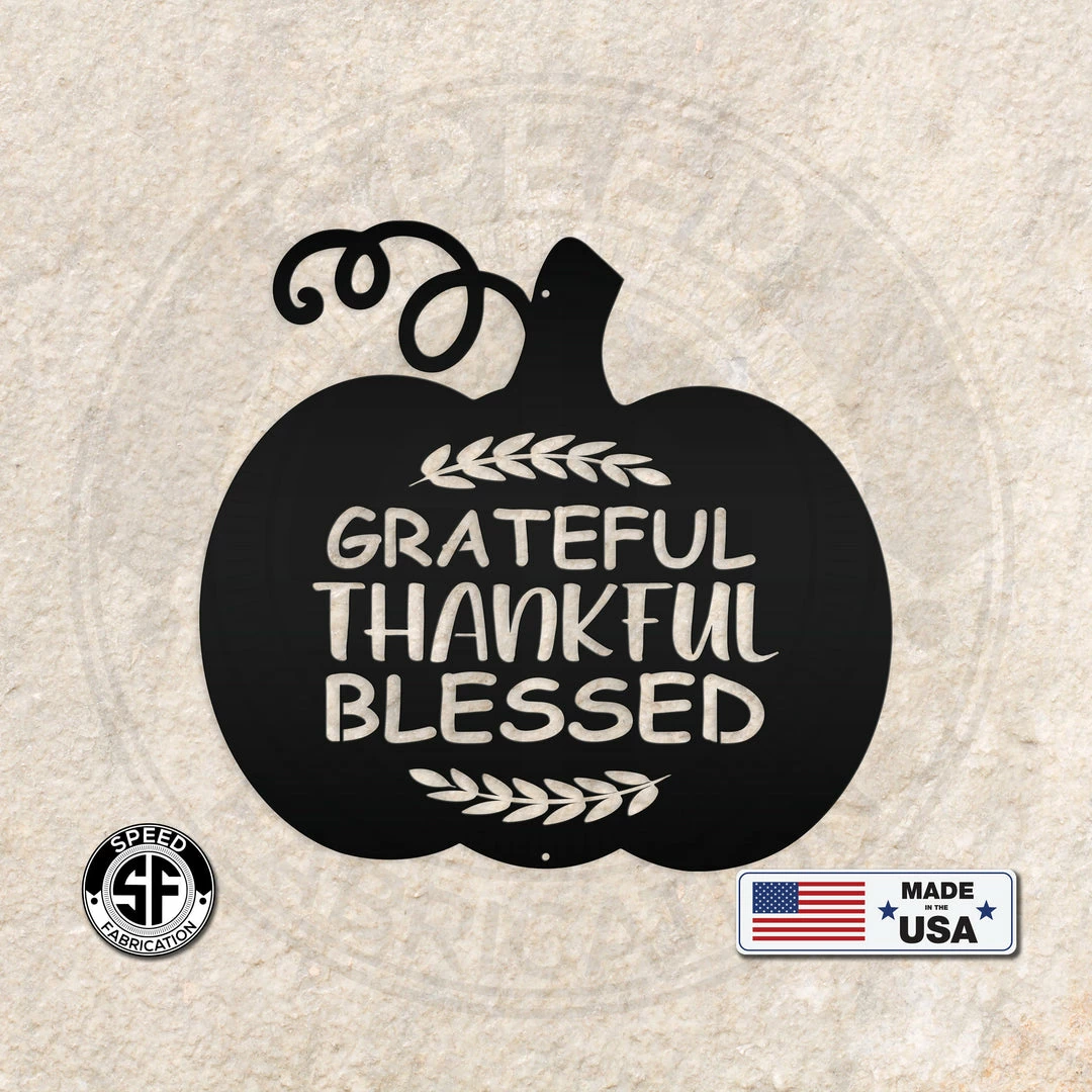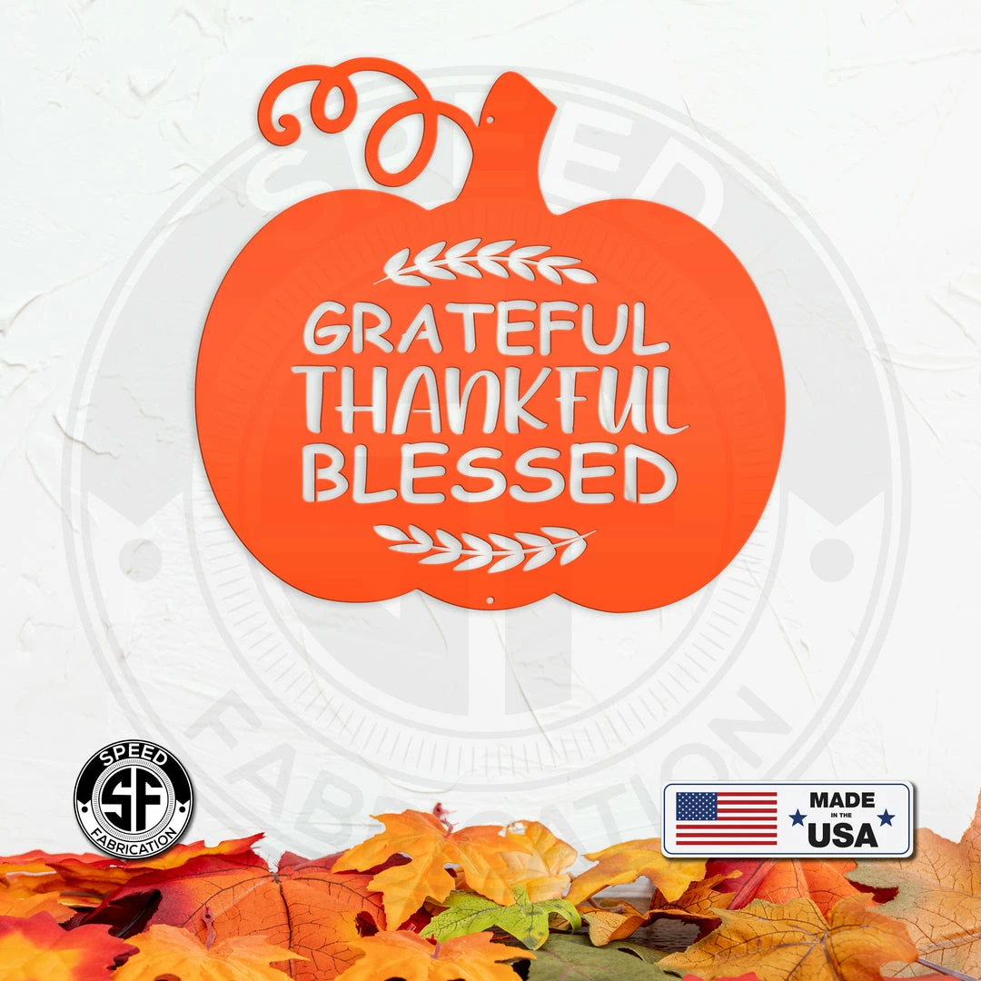 Our Grateful, Thankful, Blessed Pumpkin Autumn Décor Metal Sign is the perfect Fall décor for any home. Sizing is for the width of the sign.