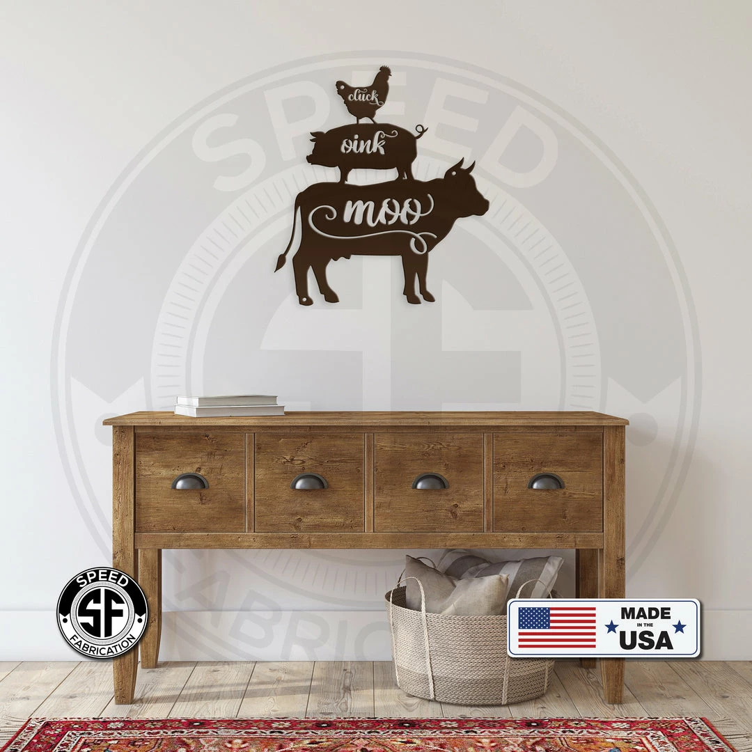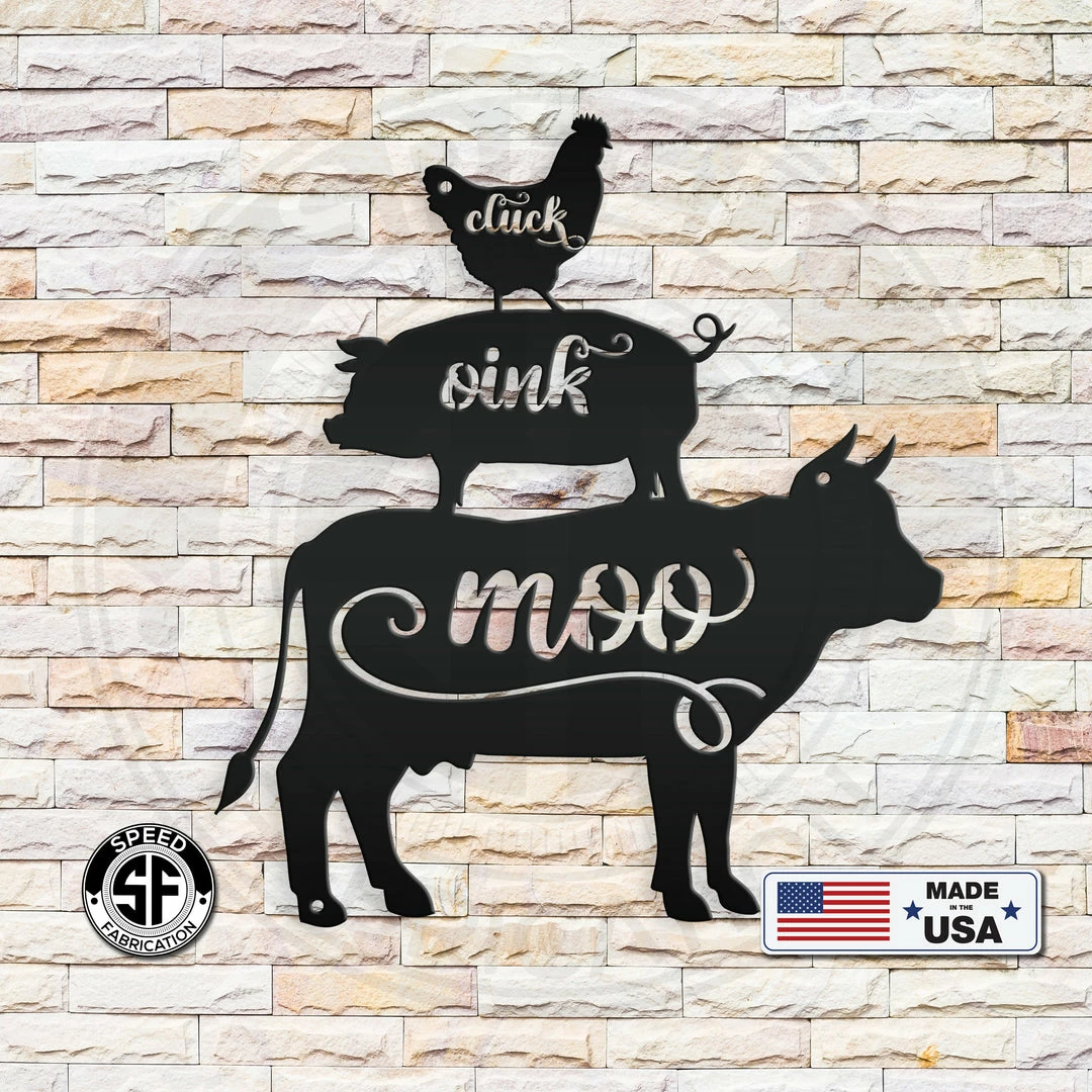 Our Cluck Oink Moo Metal Sign is the perfect decor for any farm house. Also makes a great gift for the farmer in your life. Our 12″ through 28″ signs are made from 16 gauge steel, 30″ through 36″ signs are made from 14 gauge steel with a powdercoated finish for a long lasting sign indoors or outdoors. Sizing is for the height of the sign.