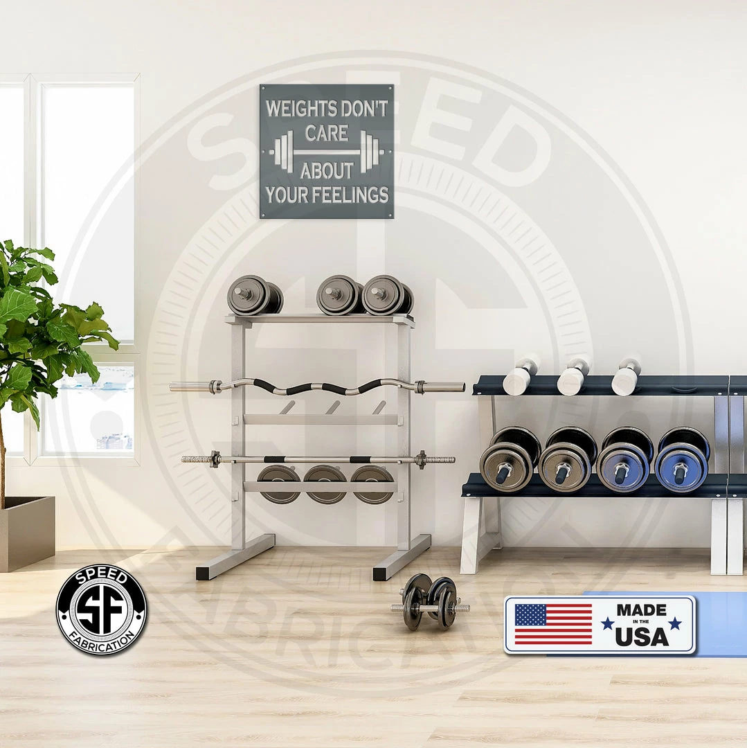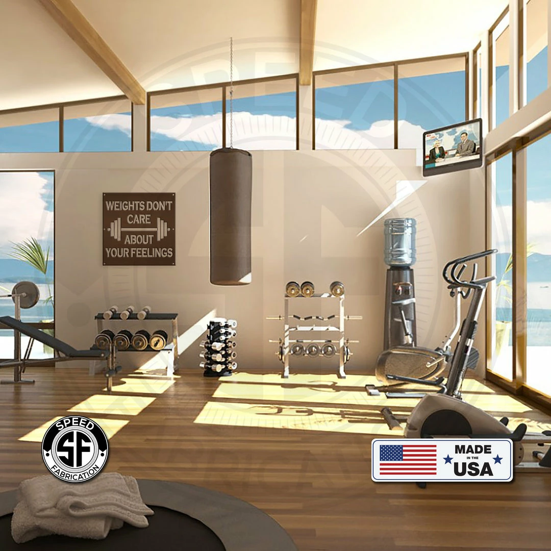 This Weights Don’t Care About Your Feelings Square Gym Metal Sign is the perfect motivational sign for your home gym.
