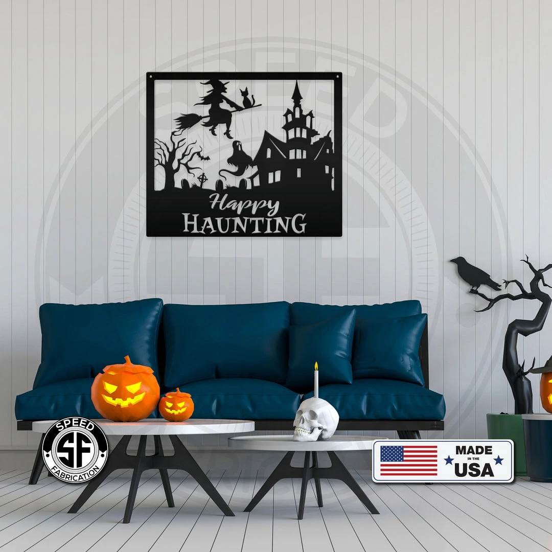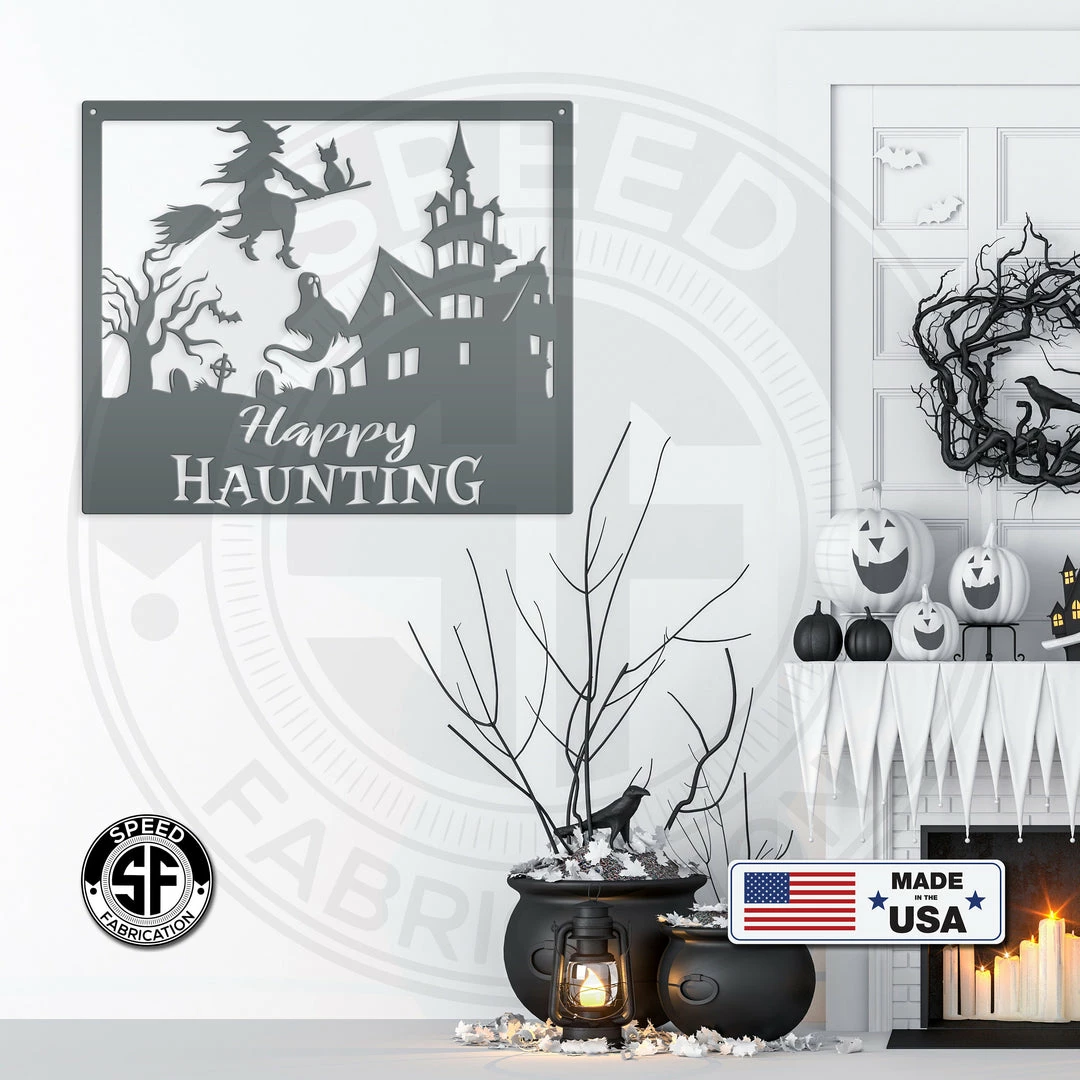 Our Happy Haunting Halloween Metal Sign is the perfect Halloween décor for any home. Our 12″ through 28″ signs are made from 16 gauge steel, 30″ through 36″ signs are made from 14 gauge steel with a powder coated finish for a long lasting sign indoors or outdoors.