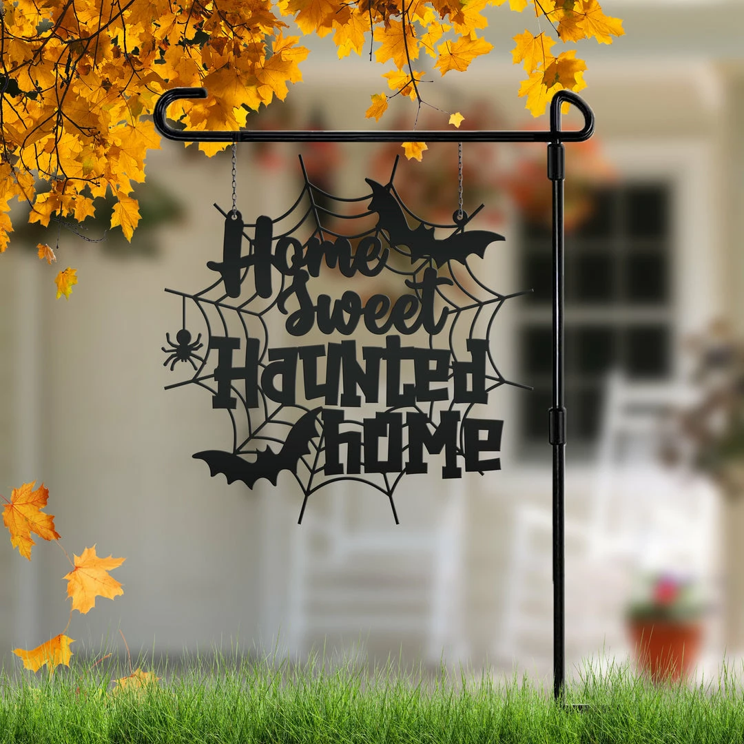 Our Home Sweet Haunted Home Metal Sign is the perfect Halloween decor for your home. Hang on your front door, or on a sign hanger in your yard. Hanging holes place on the top and bottom of the sign unless requested differently in the notes to seller at checkout.