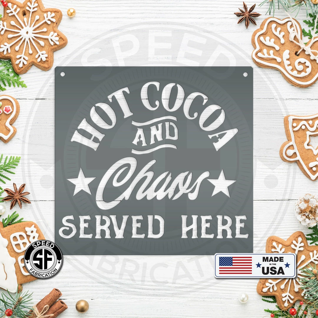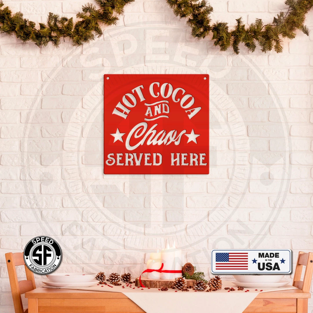 Our Hot Cocoa and Chaos Served Here Christmas Metal Sign is the perfect Christmas decor for any home. Our 12″ through 28″ signs are made from 16 gauge steel, 30″ through 36″ signs are made from 14 gauge steel with a powder coated finish for a long lasting sign indoors or outdoors.