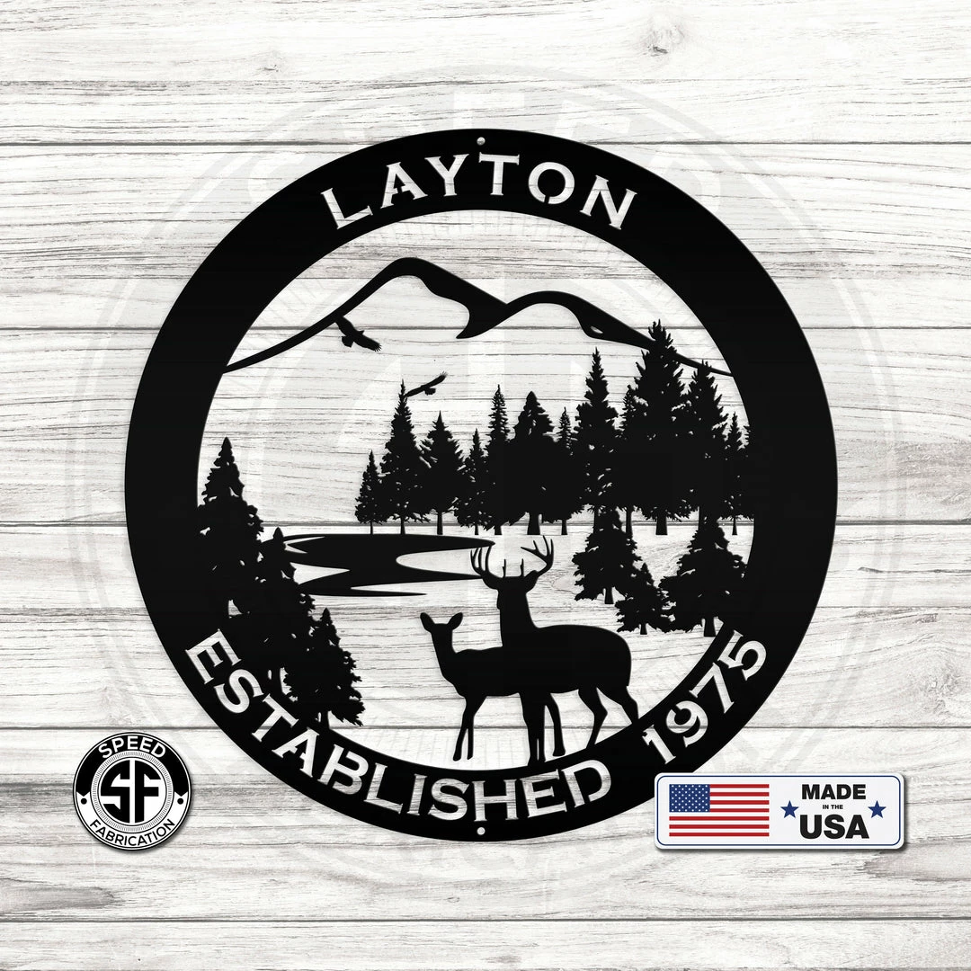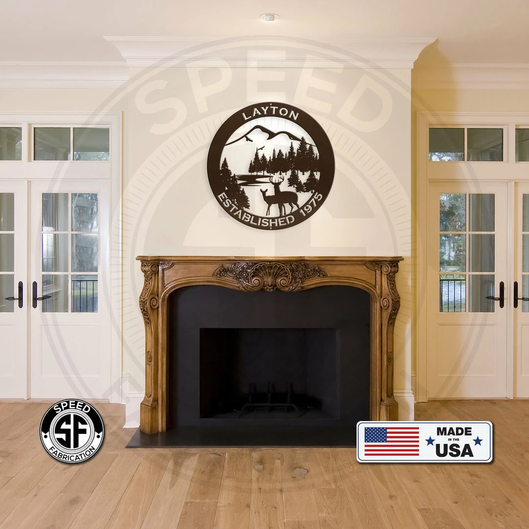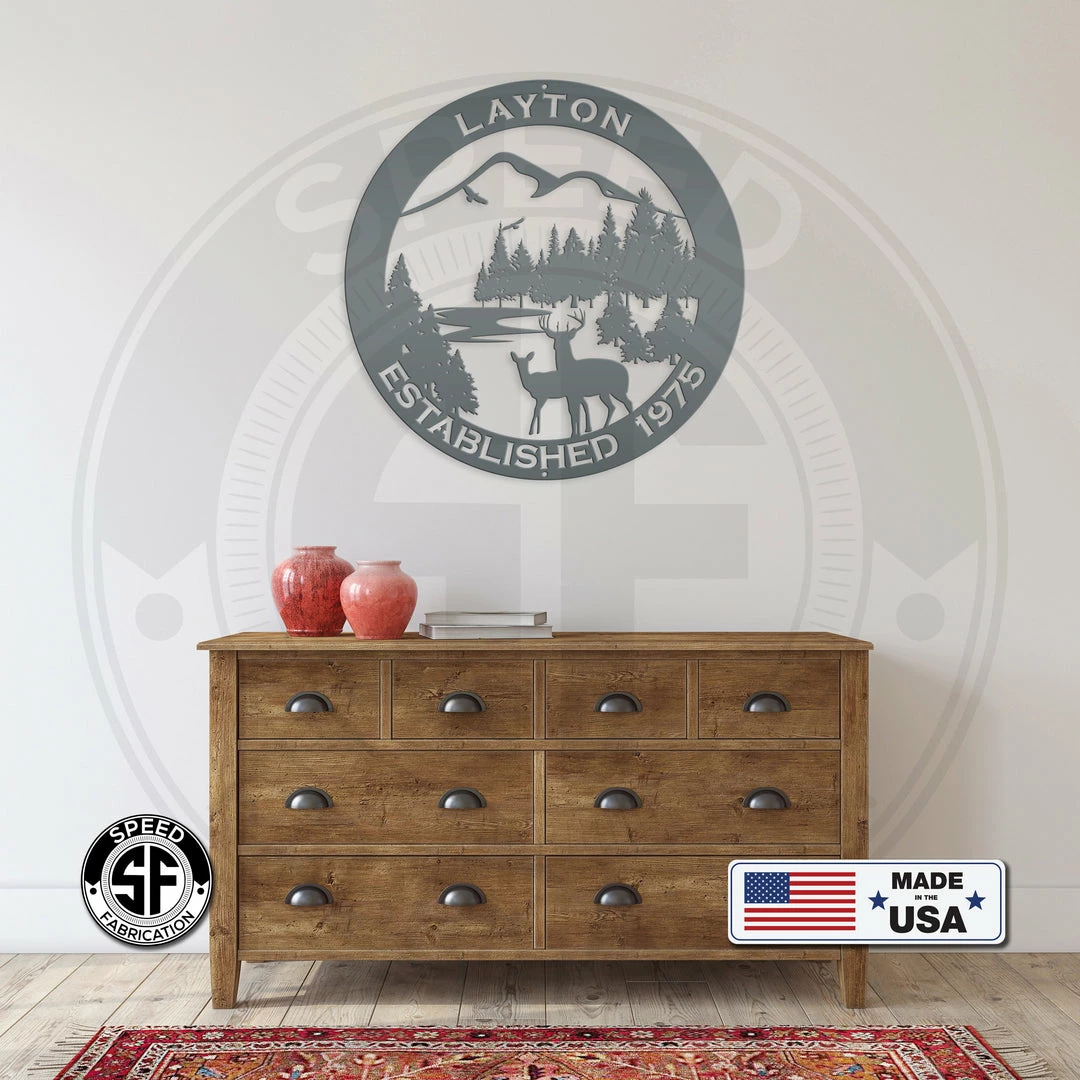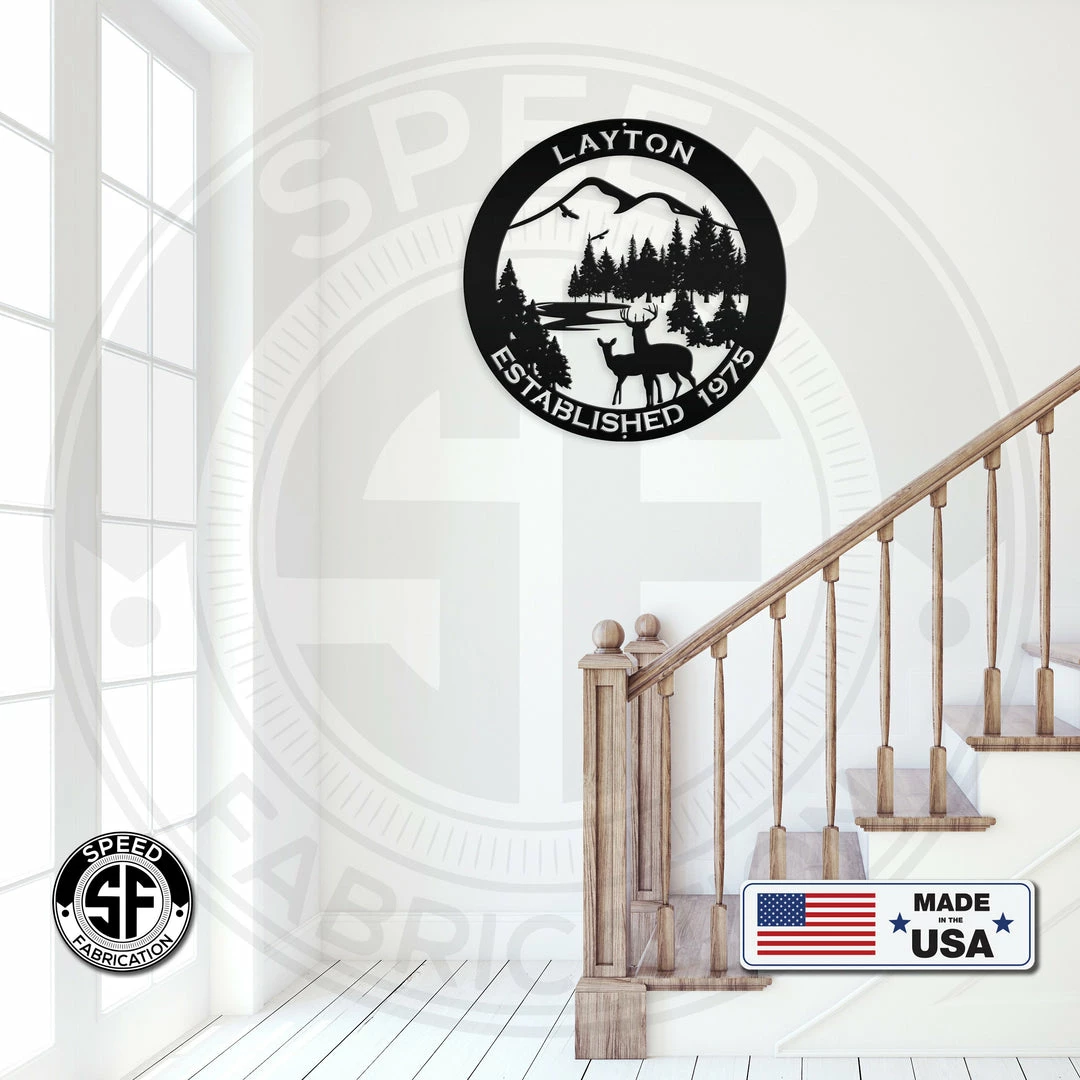 This Personalized Family Name Outdoor Mountain Deer Scene with Established Date Round Metal Sign is the perfect decor for any home. Also makes a great gift for the hunter in your life. Our 12″ through 28″ signs are made from 16 gauge steel, 30″ through 36″ signs are made from 14 gauge steel with a powder coated finish for a long lasting sign indoors or outdoors.
