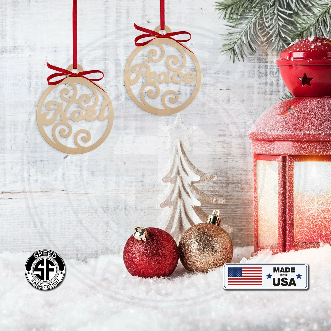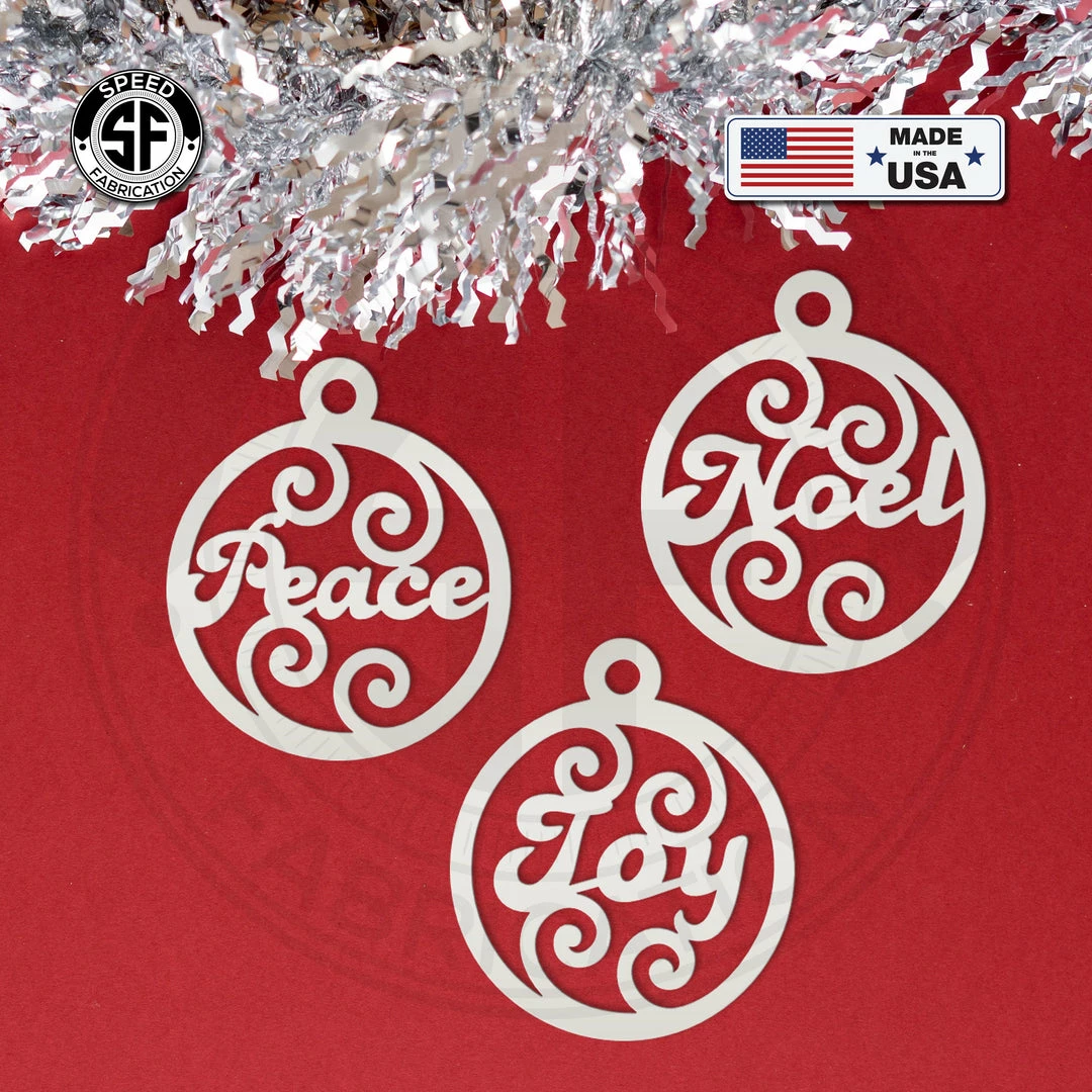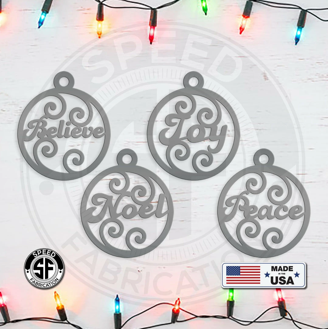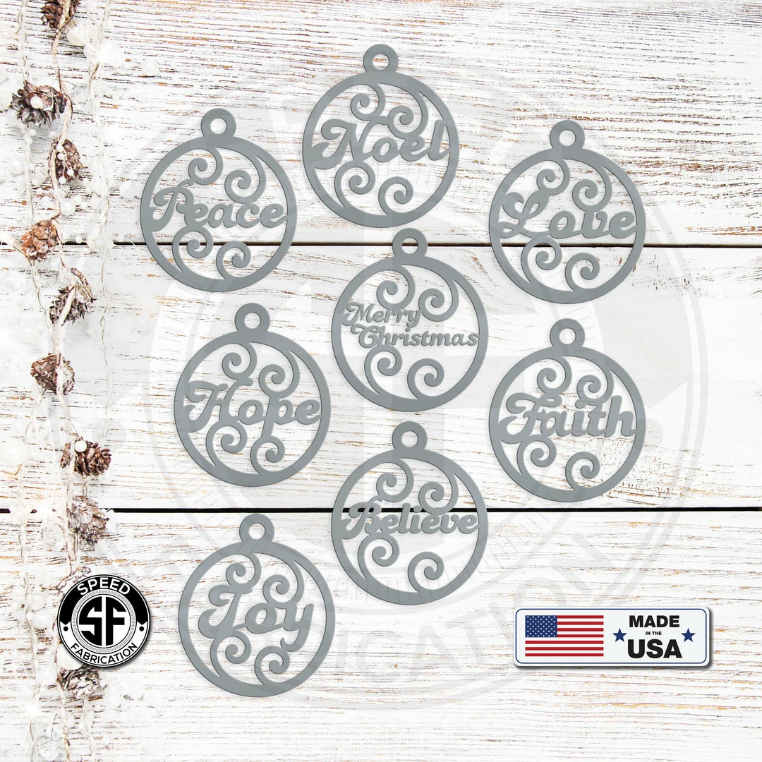 Our Assorted Inspirational Word Metal Christmas Ornaments are the perfect way to deck your halls for the holidays. Available individually or as a set of 8. Made from steel with a powder coated finish or left in a bare metal finish that will rust when exposed to humidity. These ornaments measure 4″ tall and do NOT include a ribbon or cord for hanging.