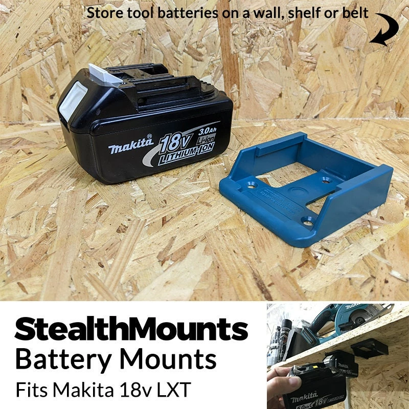 Makita LXT18V Battery Mounts By Stealth Mounts are the perfect solution for needing to mount your tool batteries in any position. These are injection molded to with stand jobsite use. These are sold in a 6 pack so you have plenty for your battery storage.