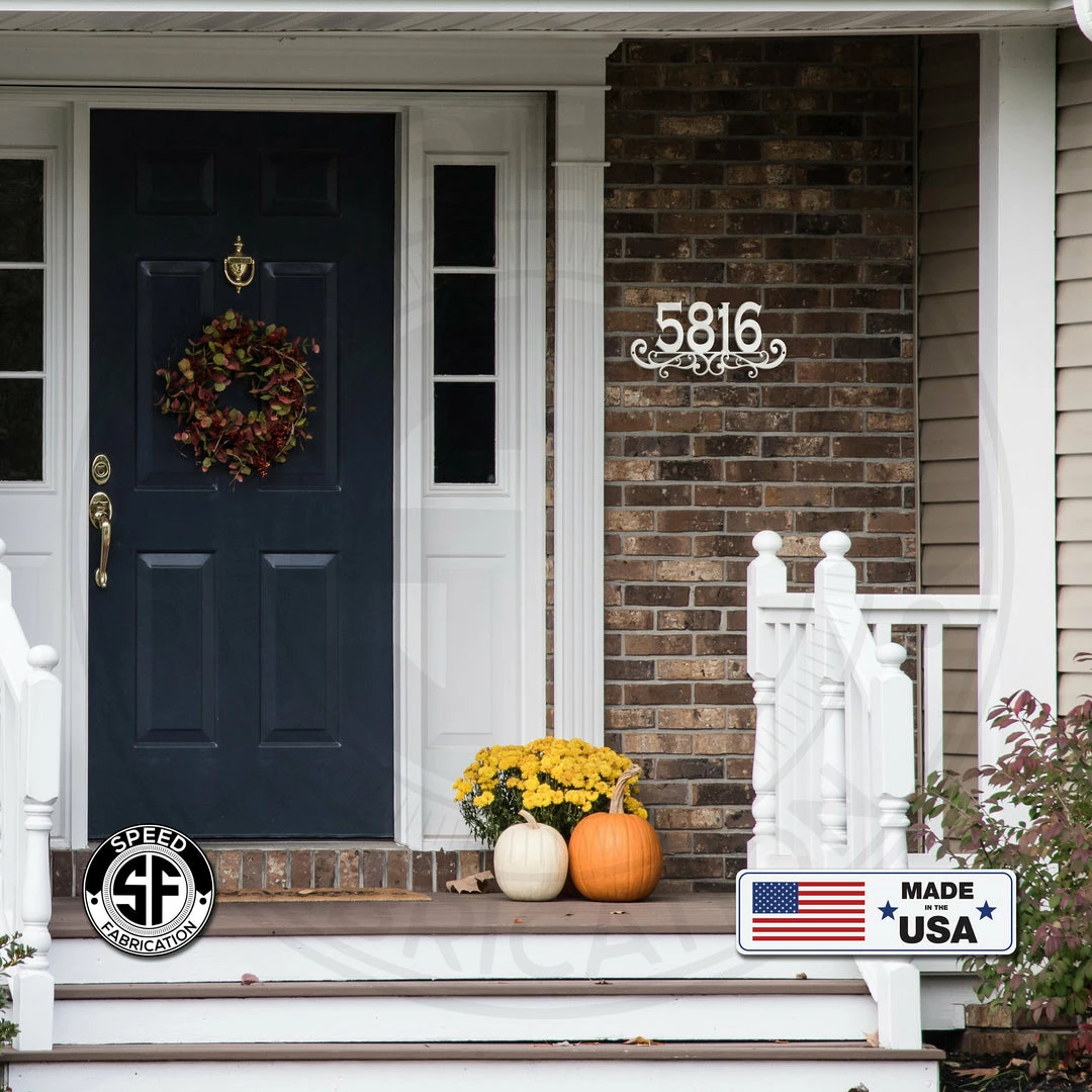 This Personalized Scroll House Numbers Metal Sign is the perfect sign to display your home address. Made from 14-gauge steel with a powder coated finish for a long-lasting sign indoors or outdoors. Dimensions measure from each edge of the scroll for the width and from the bottom of the scroll to the top of the numbers for the height. Please contact us with further sizing questions. Here are the full dimensions of all of our sizes including the height of the numbers:
