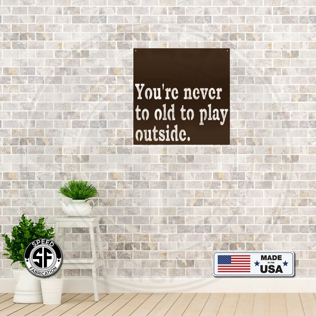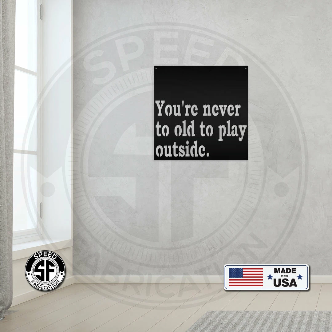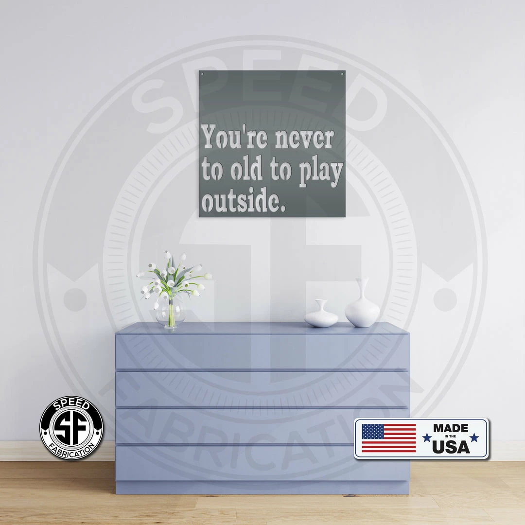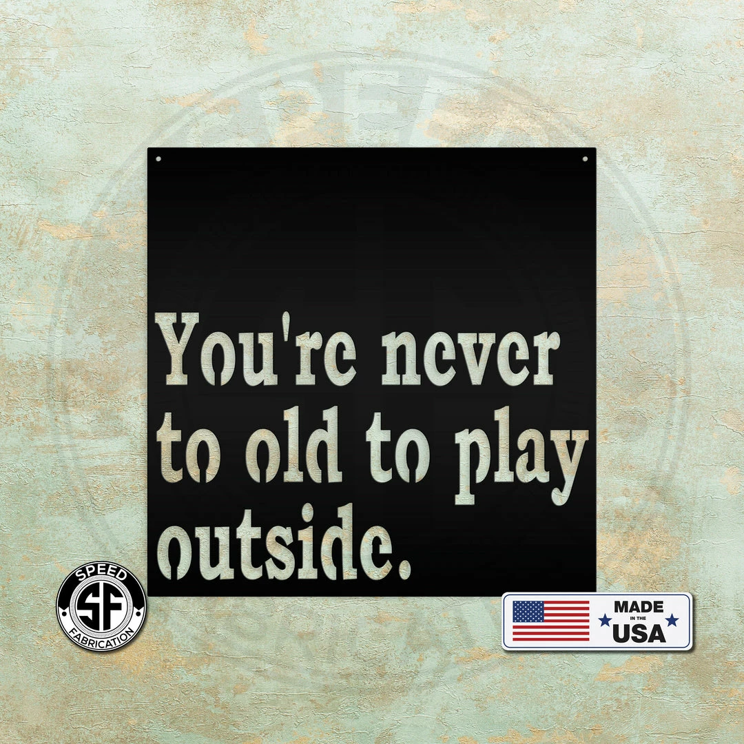 This Your Never To Old To Play Outside Metal Sign is the perfect dรฉcor for your home. Our 12″ through 28″ signs are made from 16 gauge steel, 30″ through 36″ signs are made from 14 gauge steel with a powder coated finish for a long lasting sign indoors or outdoors.