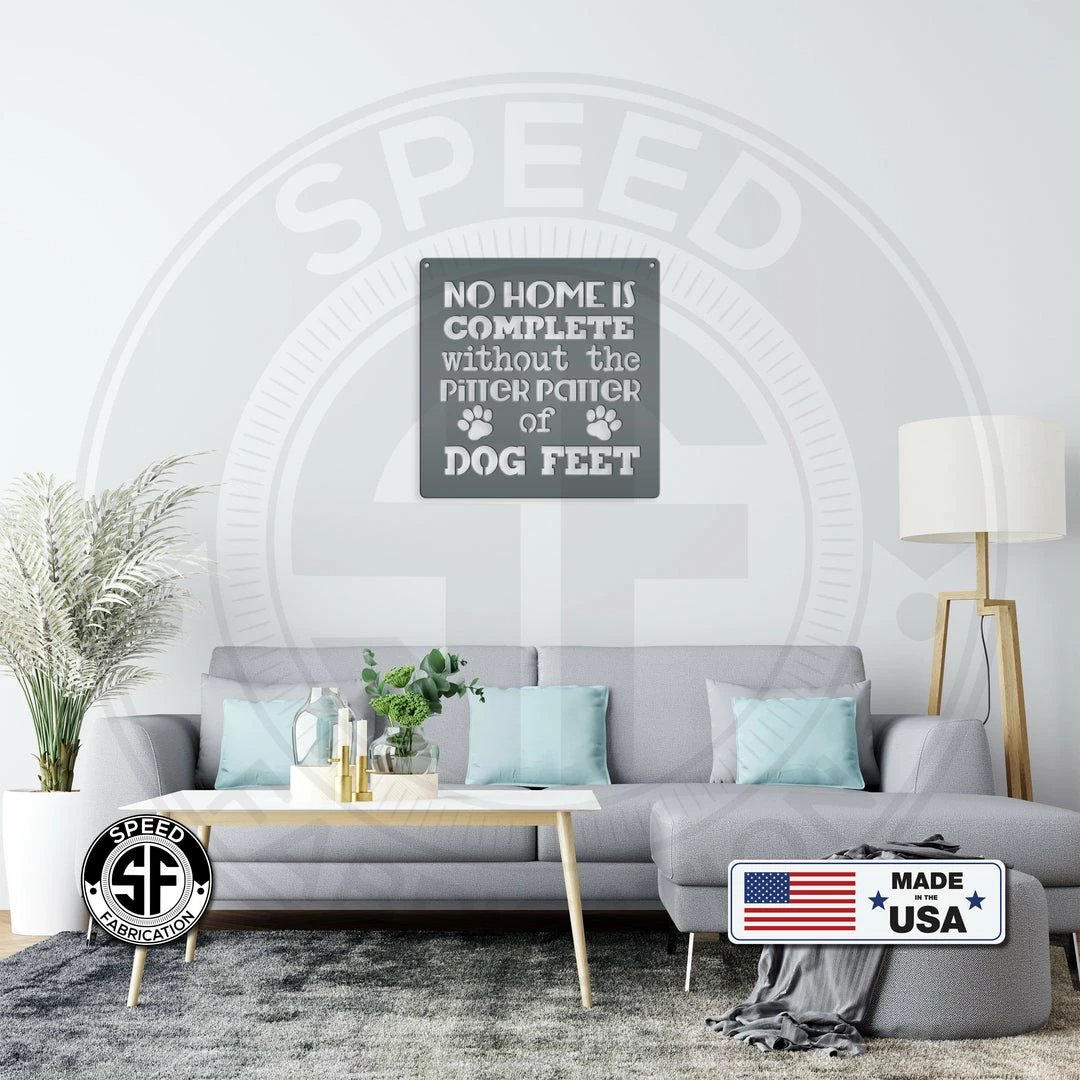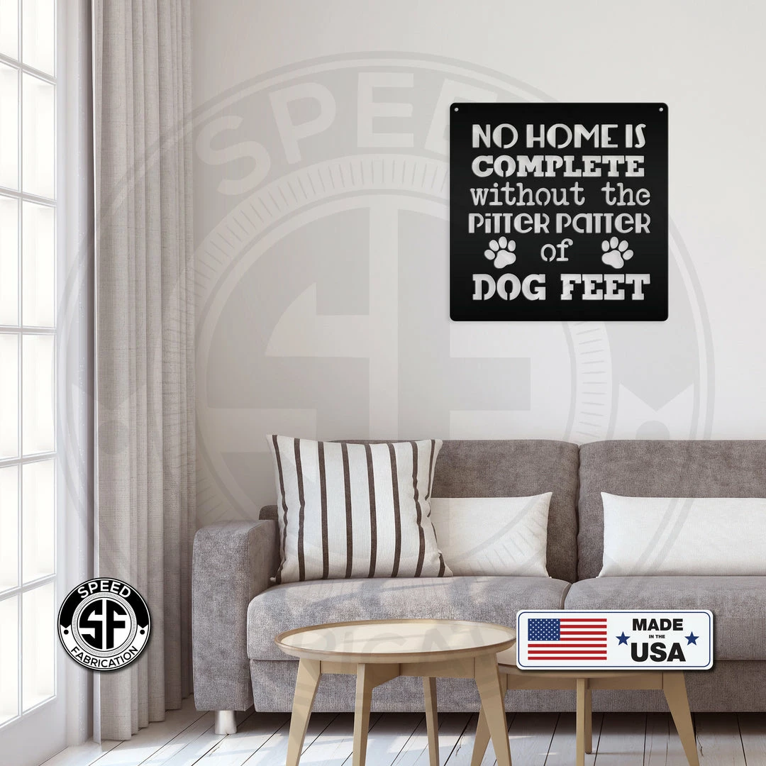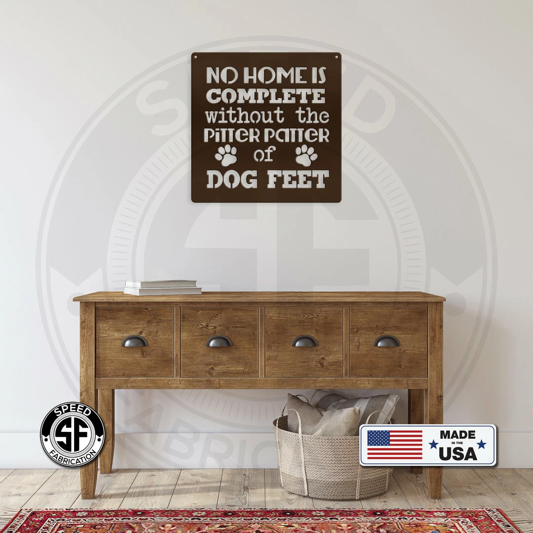 This No Home Is Complete Without the Pitter Patter Of Dog Feet Metal Sign is the perfect sign for any home. Makes a great gift for the dog lover in your life. Our 12″ through 28″ signs are made from 16 gauge steel, 30″ through 36″ signs are made from 14 gauge steel with a powder coated finish for a long lasting sign indoors or outdoors.