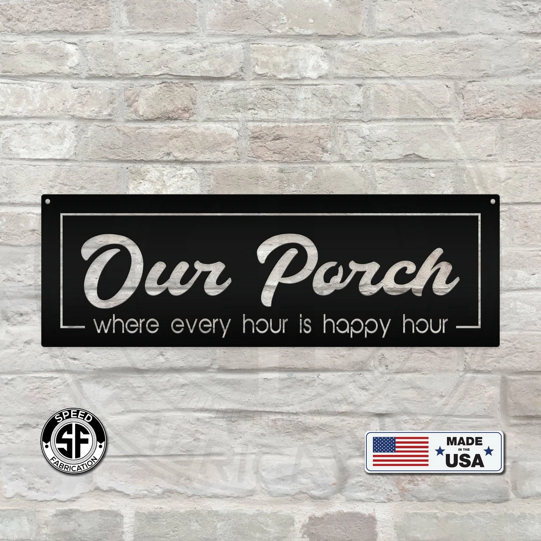 This Our Porch Where Every Hour Is Happy Hour Metal Sign is the perfect dรฉcor for your front porch. Our 12″ through 28″ signs are made from 16 gauge steel, 30″ through 36″ signs are made from 14 gauge steel with a powder coated finish for a long lasting sign indoors or outdoors.