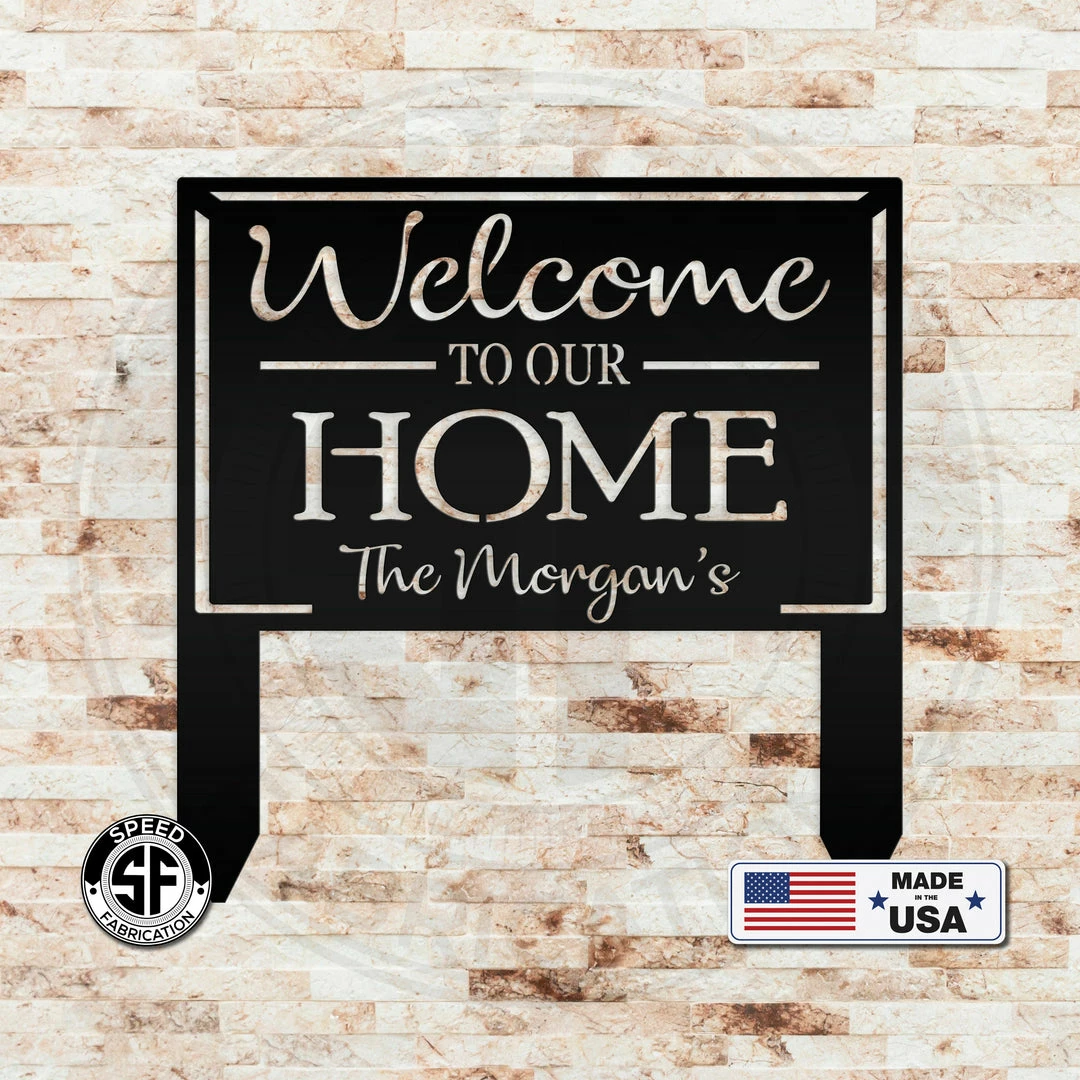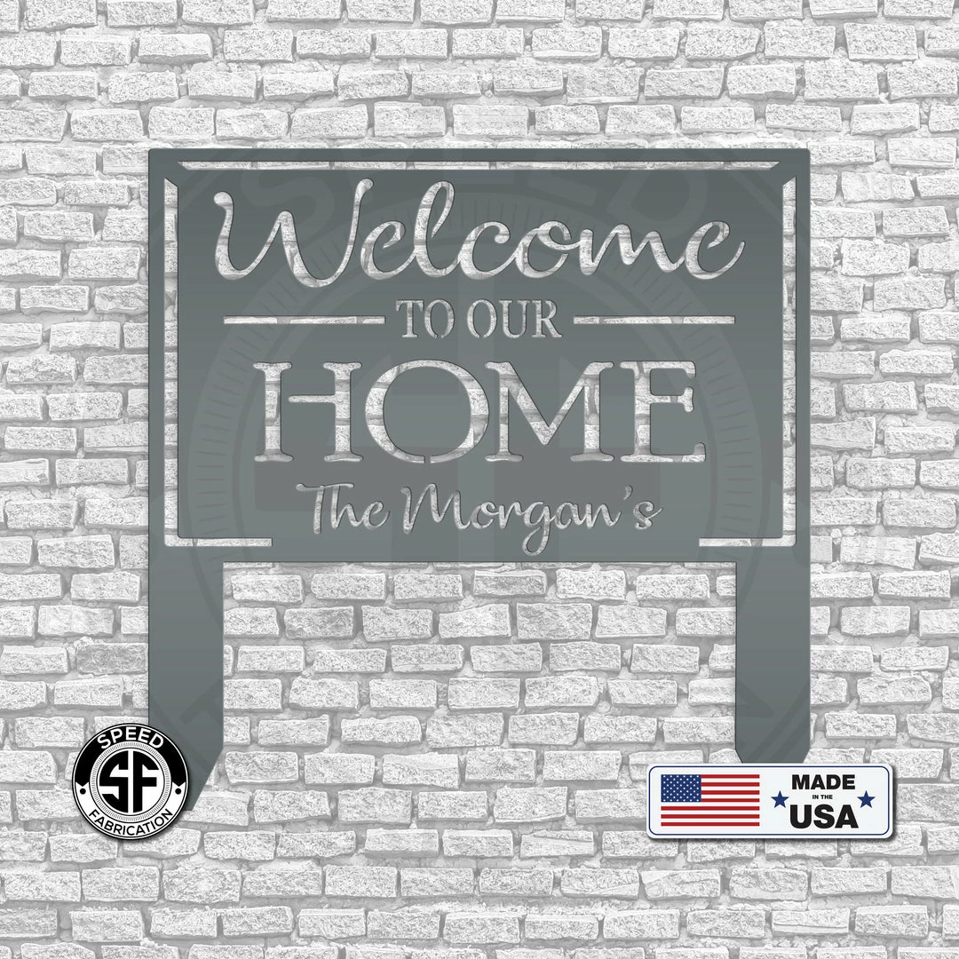 This Personalized Welcome to our Home Metal Yard Stake Sign is the perfect sign to welcome guests to your home. Makes a great housewarming gift. Sizing is for the height of the sign including the stakes. Our yard stake signs are made from 14 gauge steel with a powder coated finish for a long lasting sign indoors or outdoors.