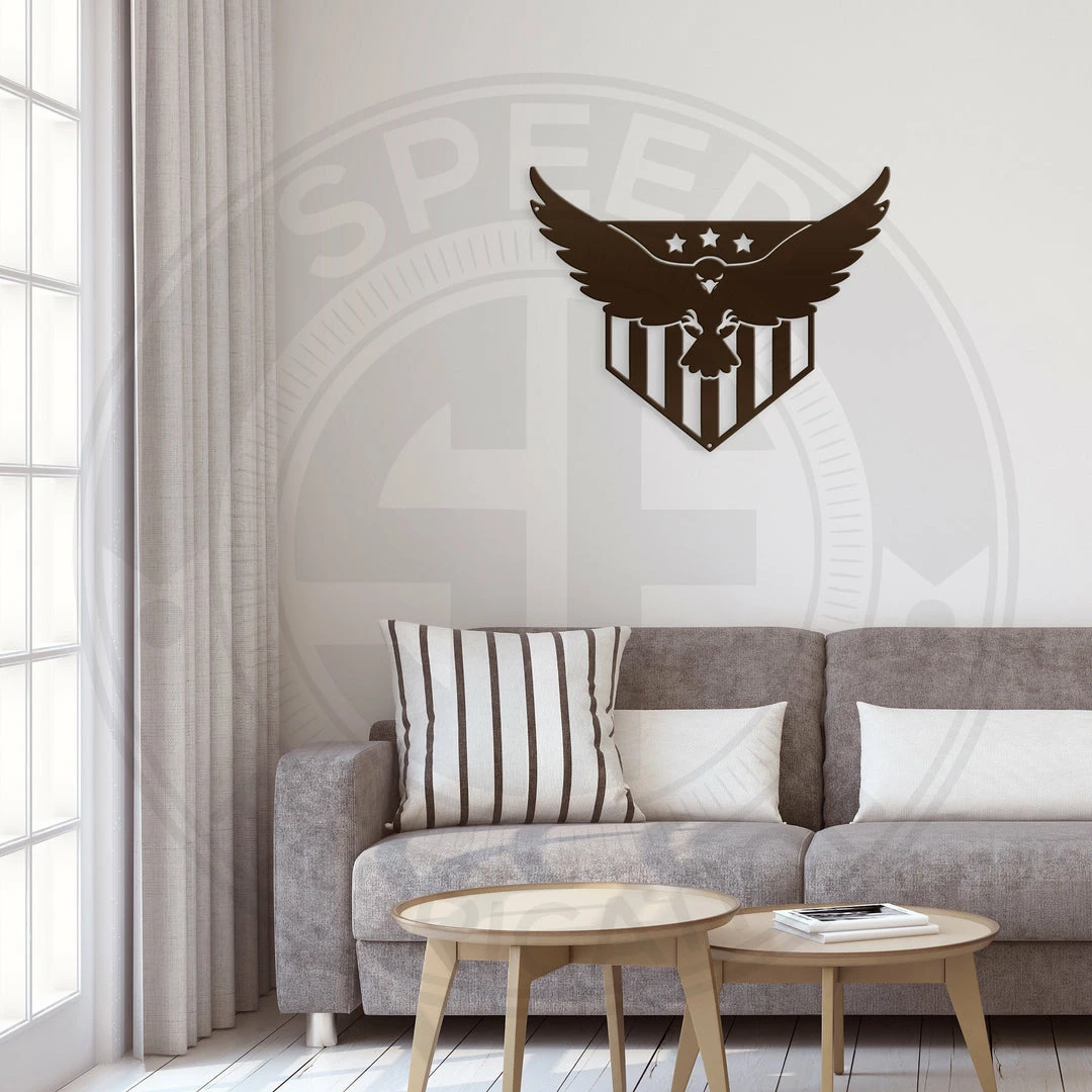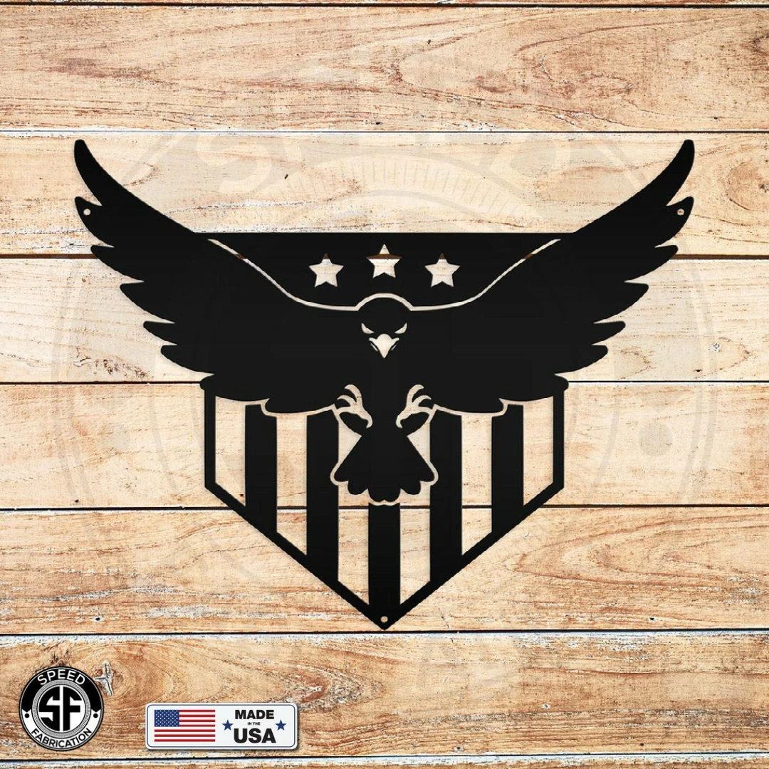 This American Eagle Metal Sign is the perfect decor for any home. Our 12″ through 28″ signs are made from 16 gauge steel, 30″ through 36″ signs are made from 14 gauge steel with a powder coated finish for a long lasting sign indoors or outdoors.