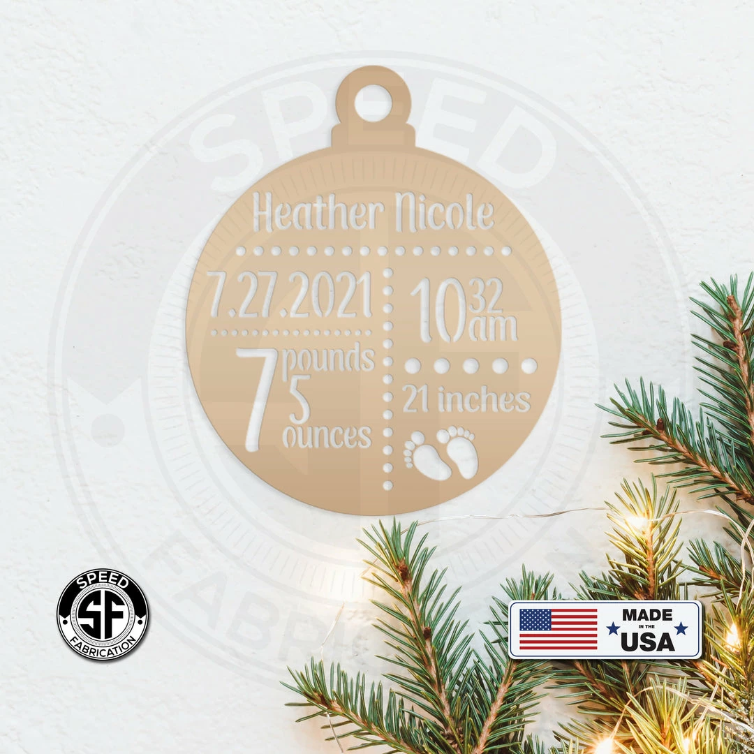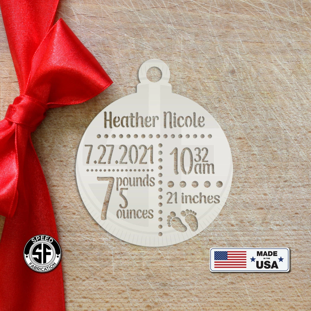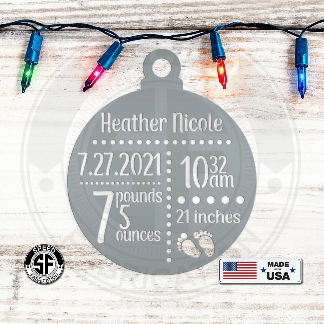 This Personalized Baby Announcement Metal Christmas Ornament is the perfect ornament to celebrate baby’s first Christmas. Made from steel with a powder coated finish or left in a bare metal finish that will rust when exposed to humidity. This ornament measures 4″ tall and just over 4″ wide and does NOT include a ribbon or cord for hanging.