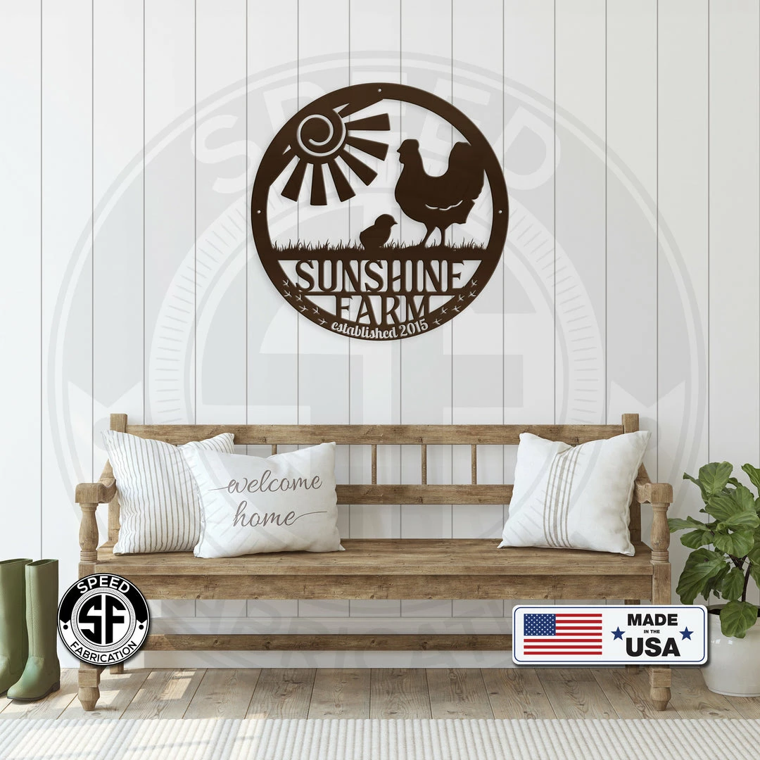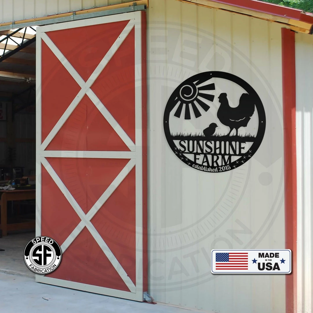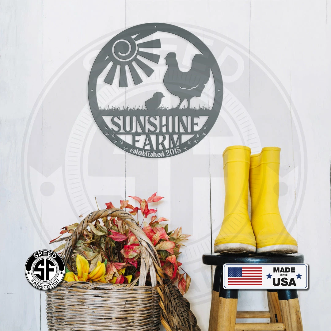 This Personalized Family Farm with Established Date Chicken Metal Sign is the perfect decor for any farm house. Makes a great gift for the chicken farmer in your life. Our 12″ through 28″ signs are made from 16 gauge steel, 30″ through 36″ signs are made from 14 gauge steel with a powder coated finish for a long lasting sign indoors or outdoors.