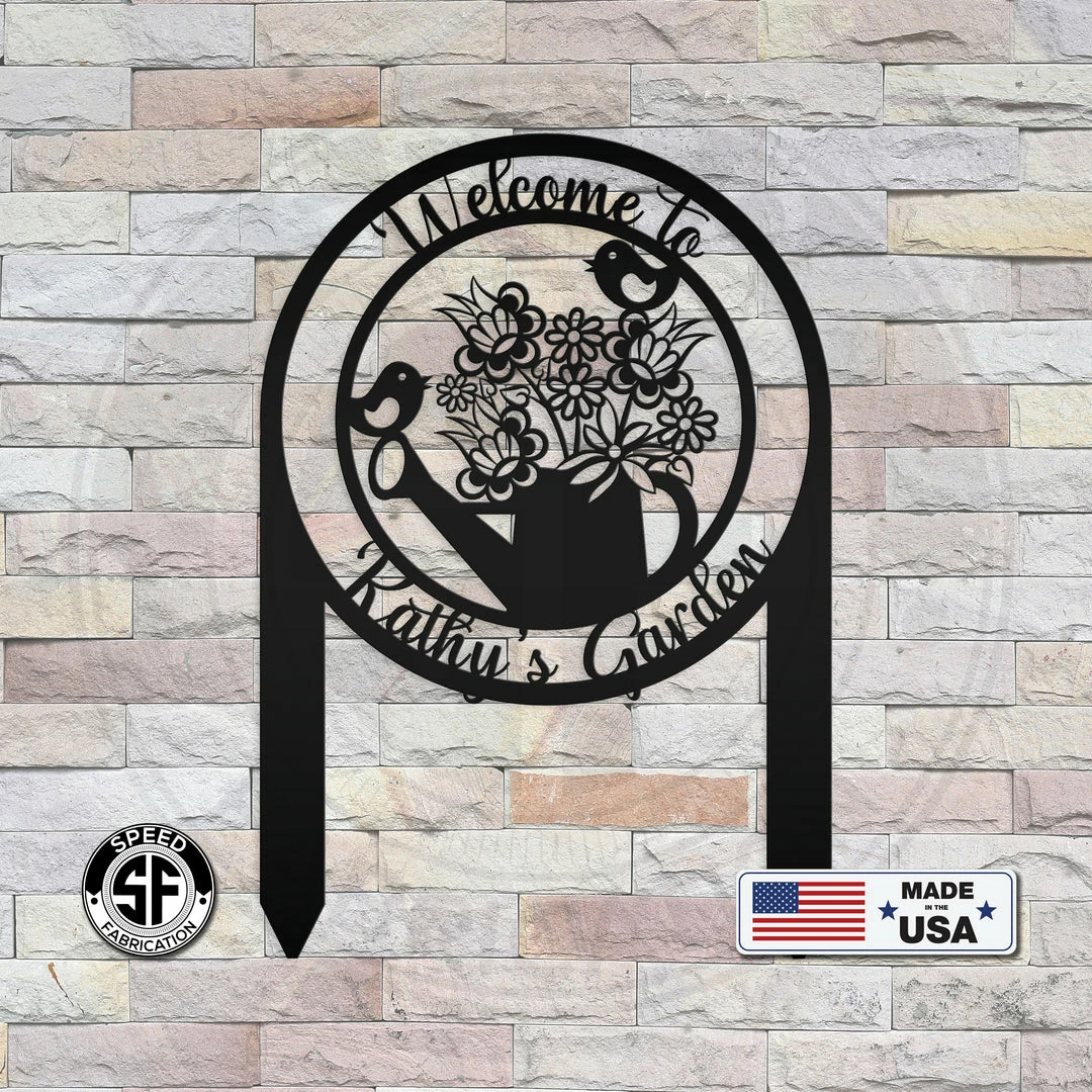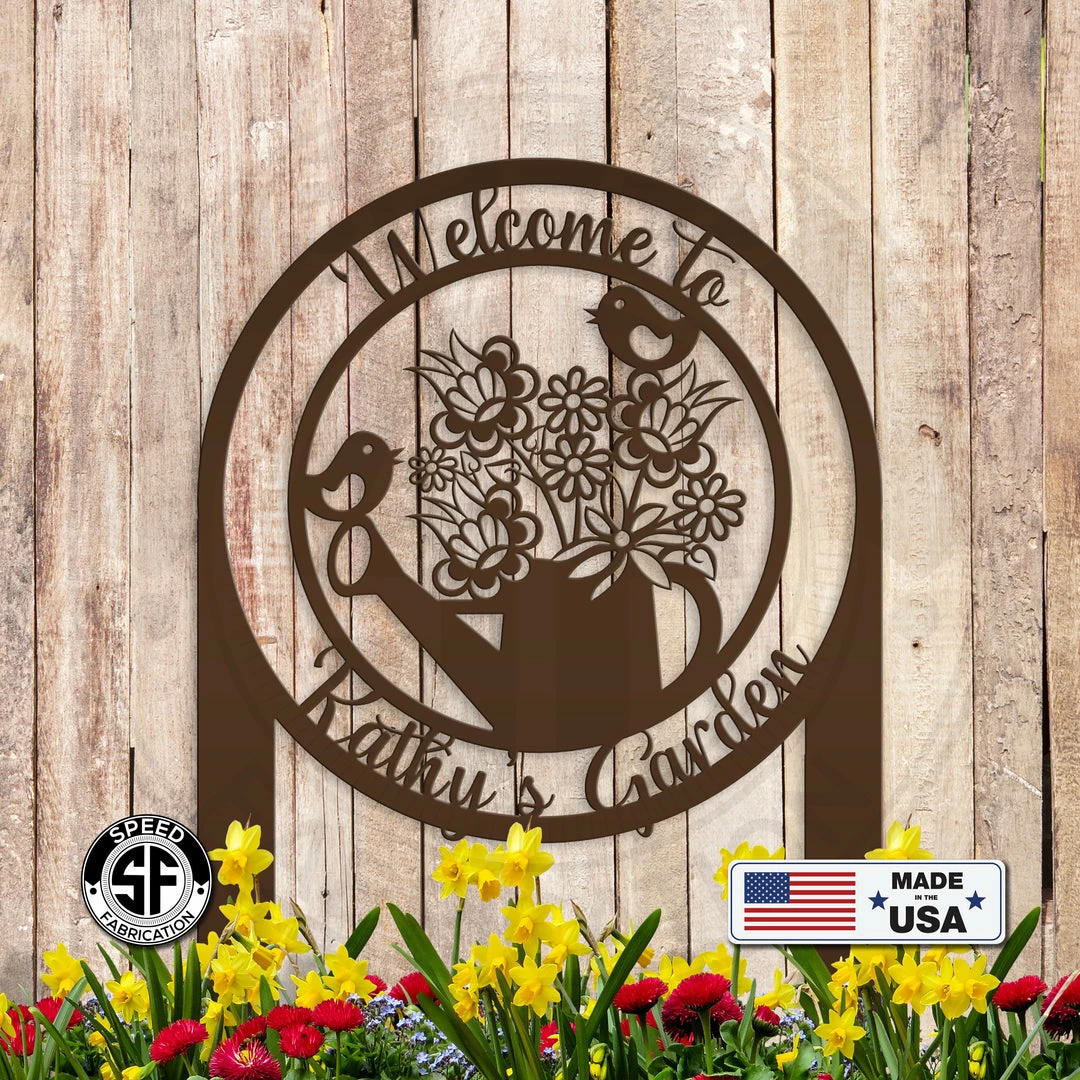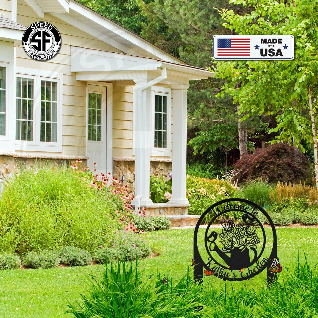 This Personalized Garden Welcome Metal Yard Stake Sign is the perfect sign to welcome guests to your garden. Makes a great Mother’s Day gift. Sizing is for the height of the sign including the stakes. Our yard stake signs are made from 14 gauge steel with a powder coated finish for a long lasting sign indoors or outdoors.