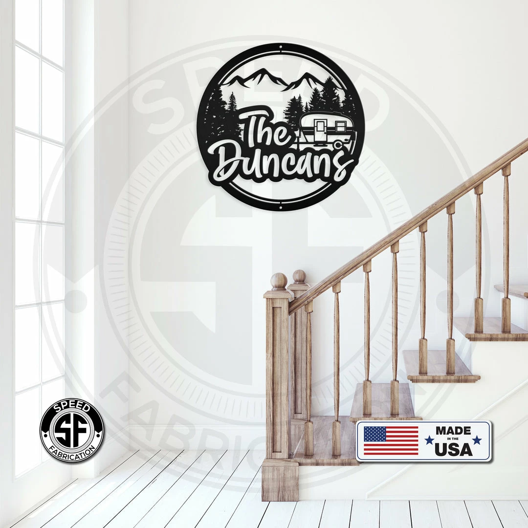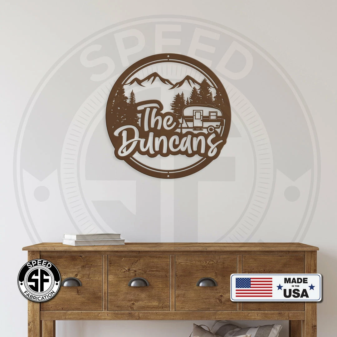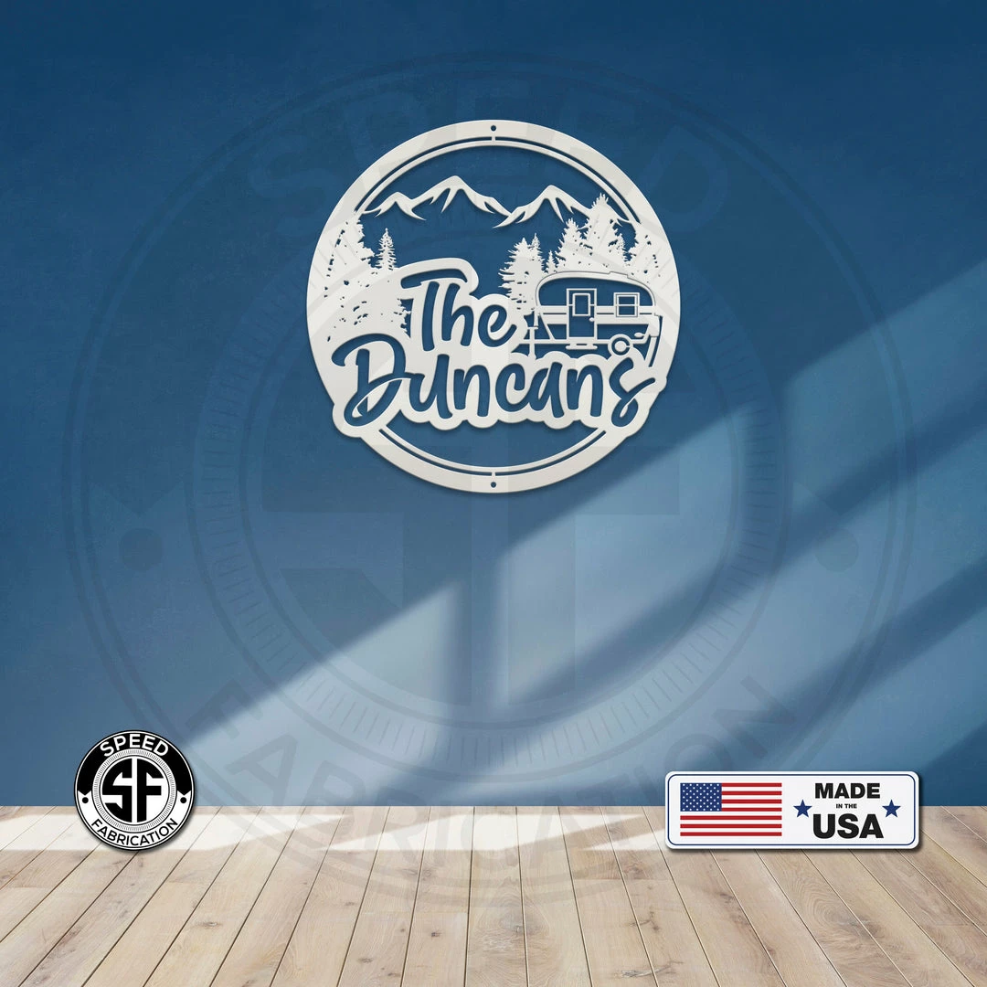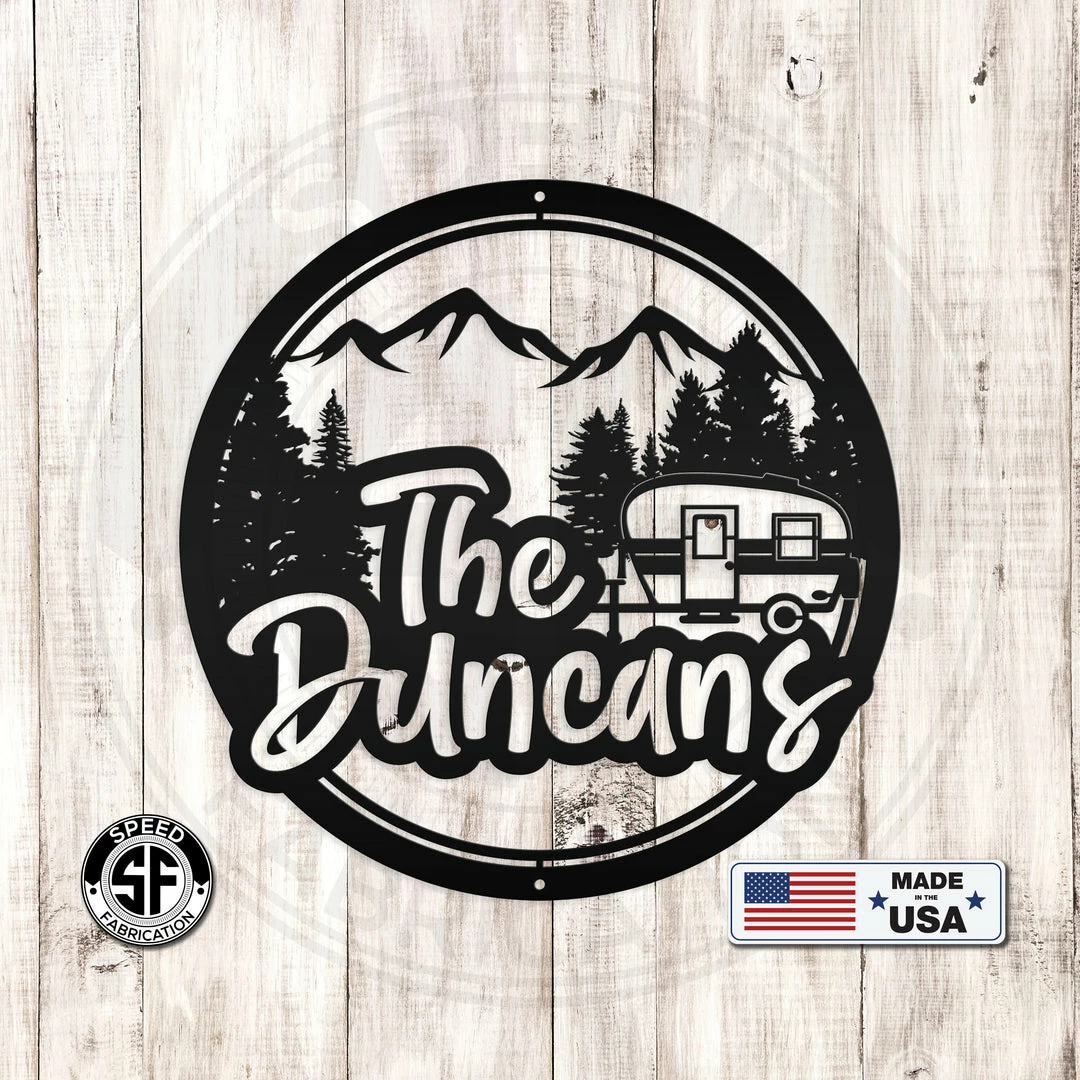 This Personalized Mountain Camper Metal Sign is the perfect dรฉcor for any camper or RV. Our 4″ ornament is made from 18-gauge steel, 5″ through 28″ signs are made from 16-gauge steel, 30″ through 36″ signs are made from 14-gauge steel with a powder coated finish for a long-lasting sign indoors or outdoors.