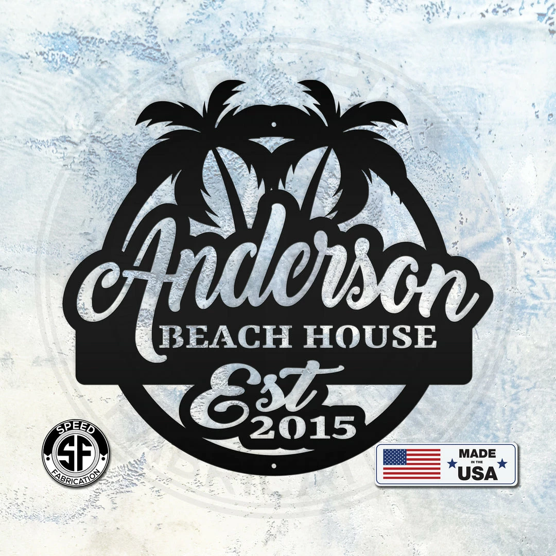 This Personalized Palm Tree Family Beach House with Established Date Metal Sign is the perfect sign for your family beach house. Pricing is for the width of the sign. Our 12″ through 28″ signs are made from 16 gauge steel, 30″ through 36″ signs are made from 14 gauge steel with a powder coated finish for a long lasting sign indoors or outdoors.