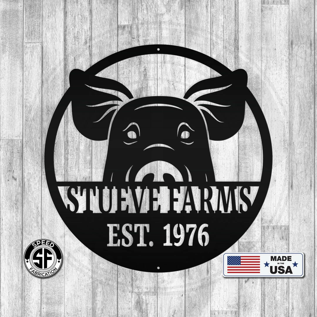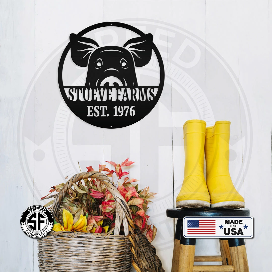 This Personalized Pig Farm with Established Date Metal Sign is the perfect decor for any farm house. Also makes a great gift for the farmer in your life. Our 12″ through 28″ signs are made from 16 gauge steel, 30″ through 36″ signs are made from 14 gauge steel with a powdercoated finish for a long lasting sign indoors or outdoors.