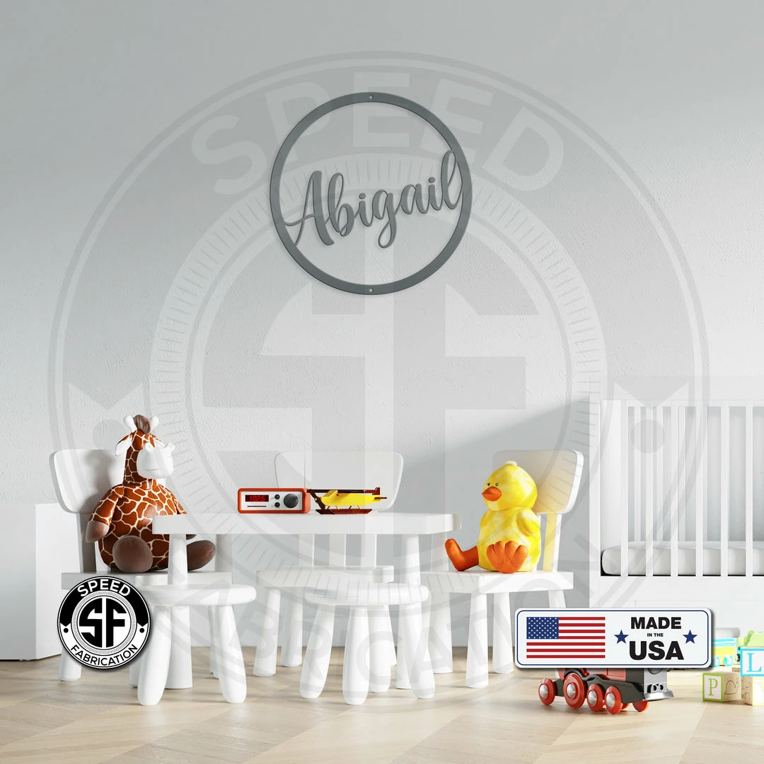 This Personalized Round Name Metal Sign is the perfect decor for any home. Customized with any name to add a personalized touch to any child’s room. Also makes a great wedding or anniversary gift.