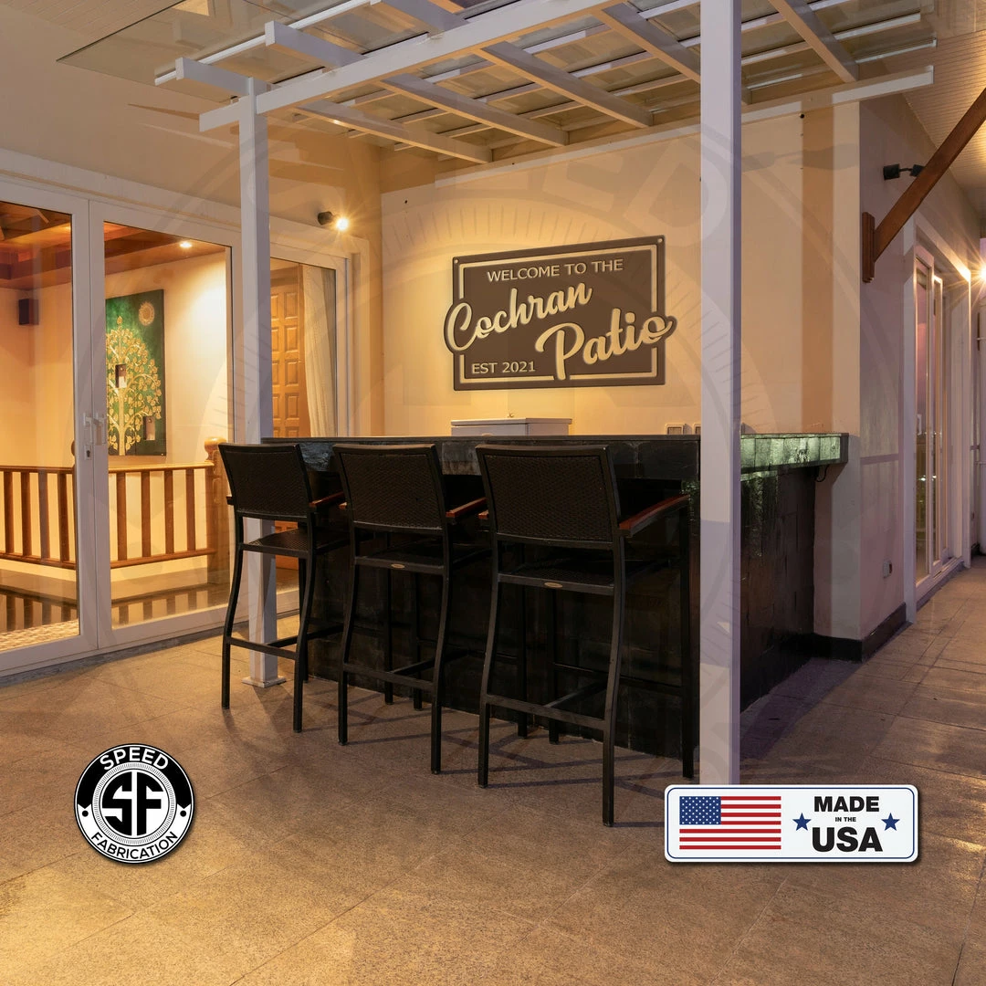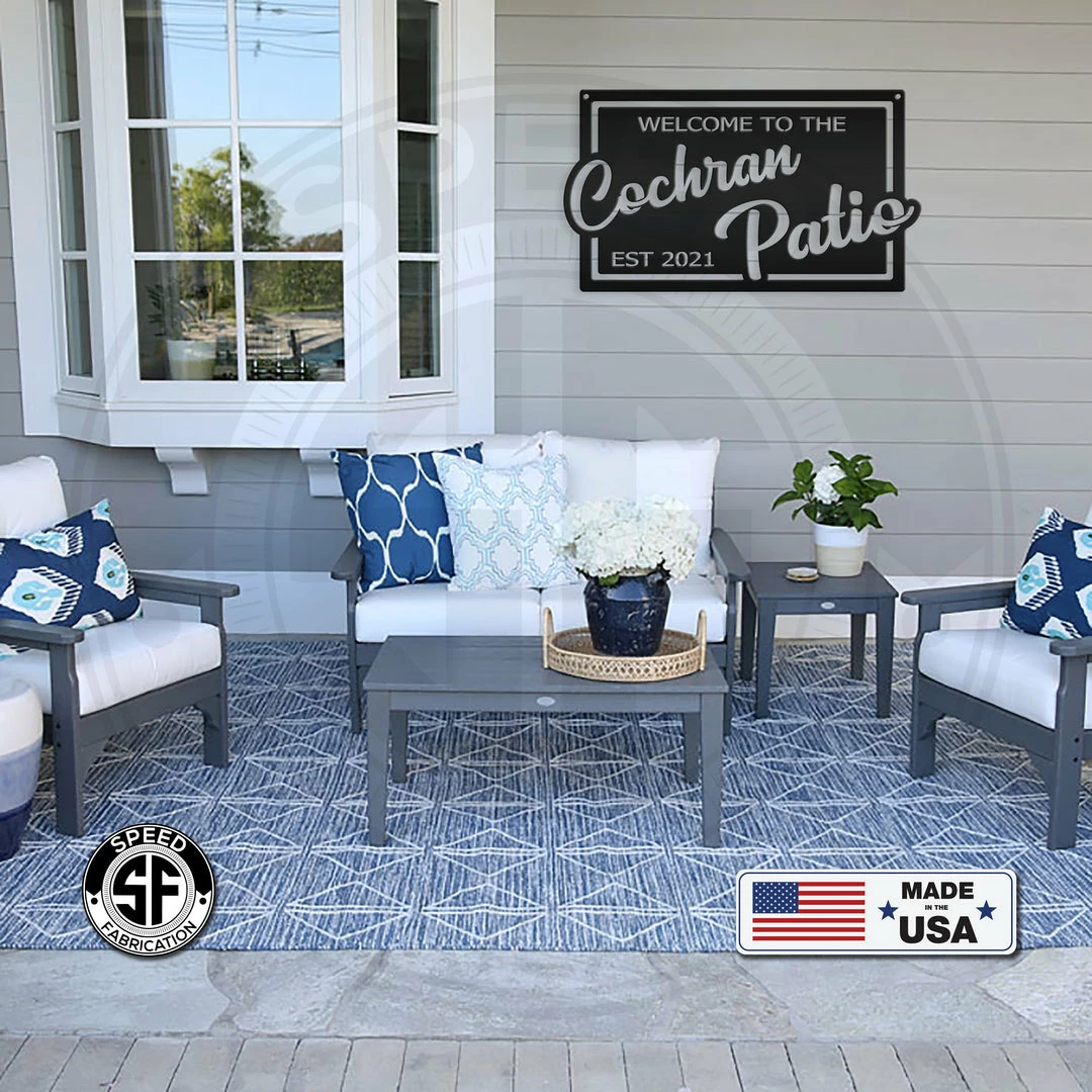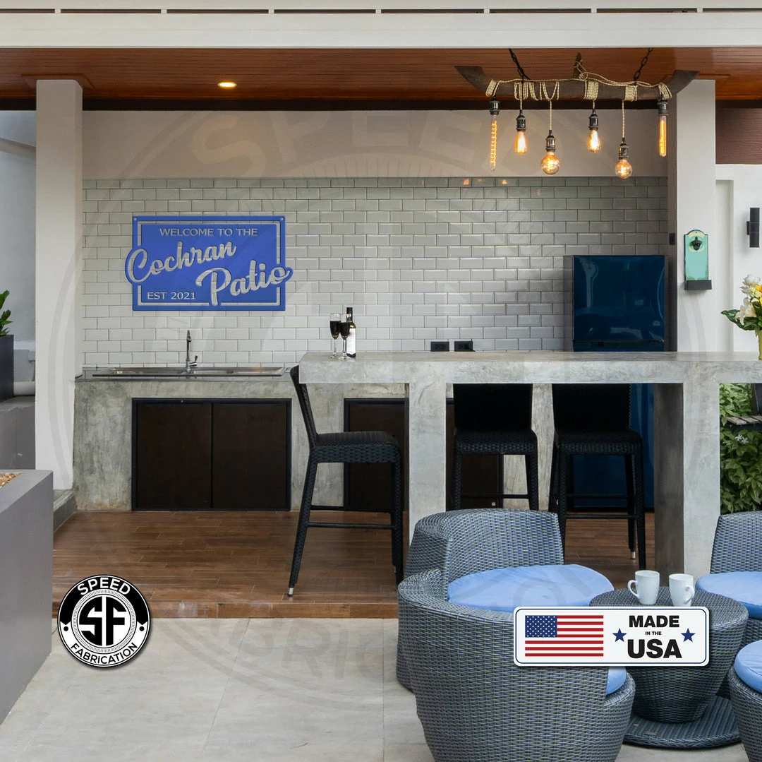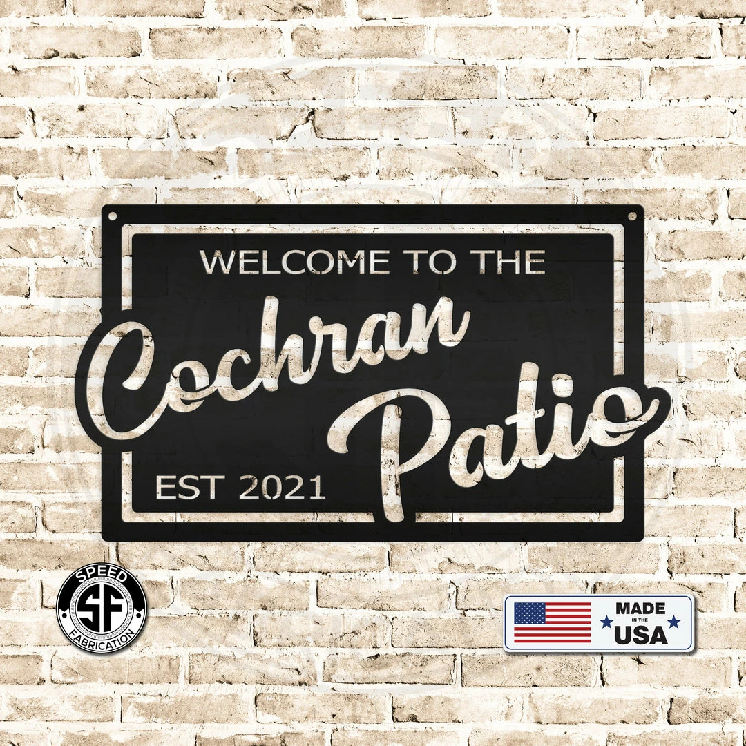 This Personalized Rectangle Welcome to the Patio with Established Date Metal Sign is the perfect dรฉcor for your backyard patio, deck, pool, barn, your business…wherever really! Leave your custom wording in the notes to seller at check out, and we will make it happen!