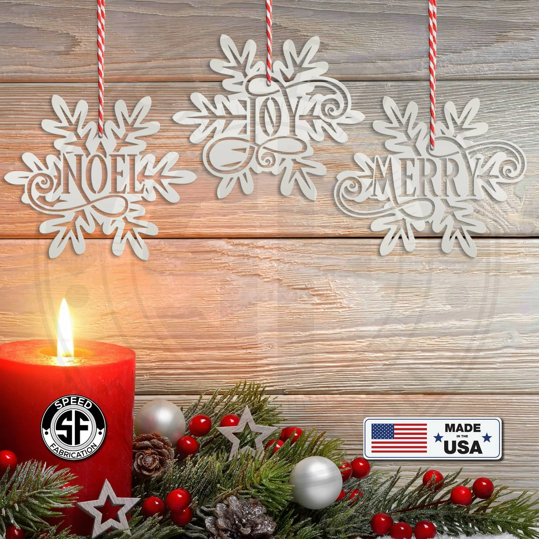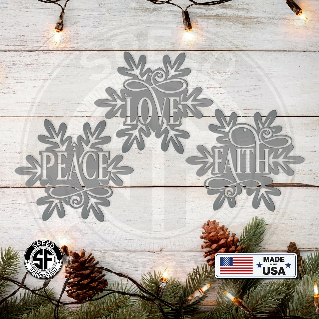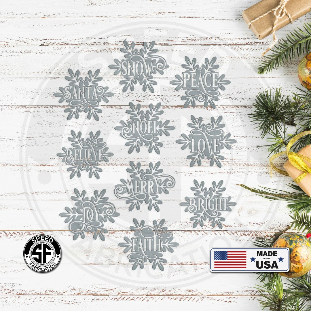Our Snowflake with Inspirational Words Metal Christmas Ornaments are the perfect way to deck your halls for the holidays. Available individually or as a set of 10. Made from 16 gauge steel with a powder coated finish or left in a bare metal finish that will rust when exposed to humidity. These ornaments measure 5″ wide and do NOT include a ribbon or cord for hanging.
