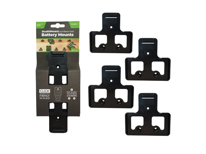 StealthMounts Battery Mounts for EGO Power+ cordless batteries. Keep your batteries organized and right where you need them. Made from strong injection molded ABS plastic with holes for mounting. Batteries ‘click’ into place and can be held at any angle.