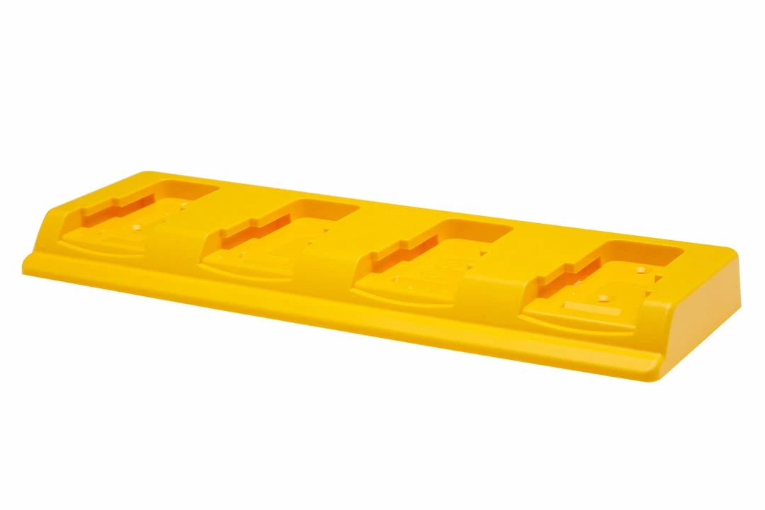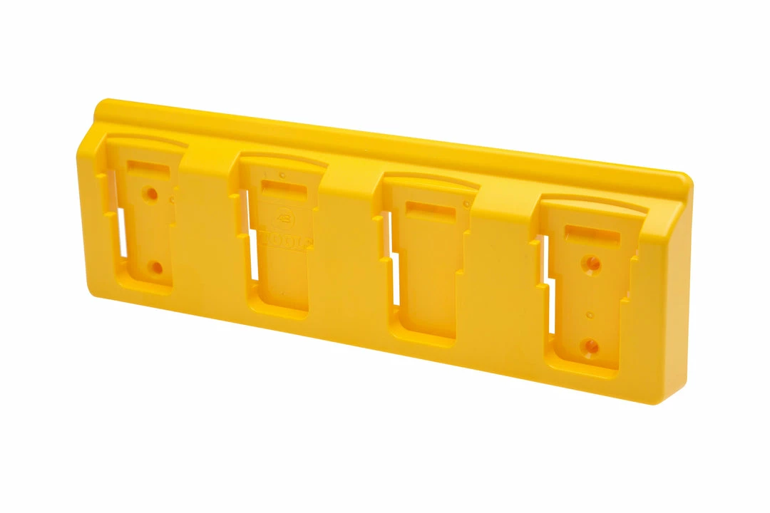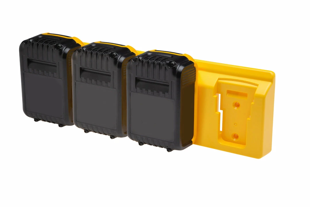 Use this holder to easily mount four 18V or 20V XR Dewalt batteries to your wall, under your workbench or in your trailer or van. Batteries clip in using the existing locking clip, so can be mounted in any direction.