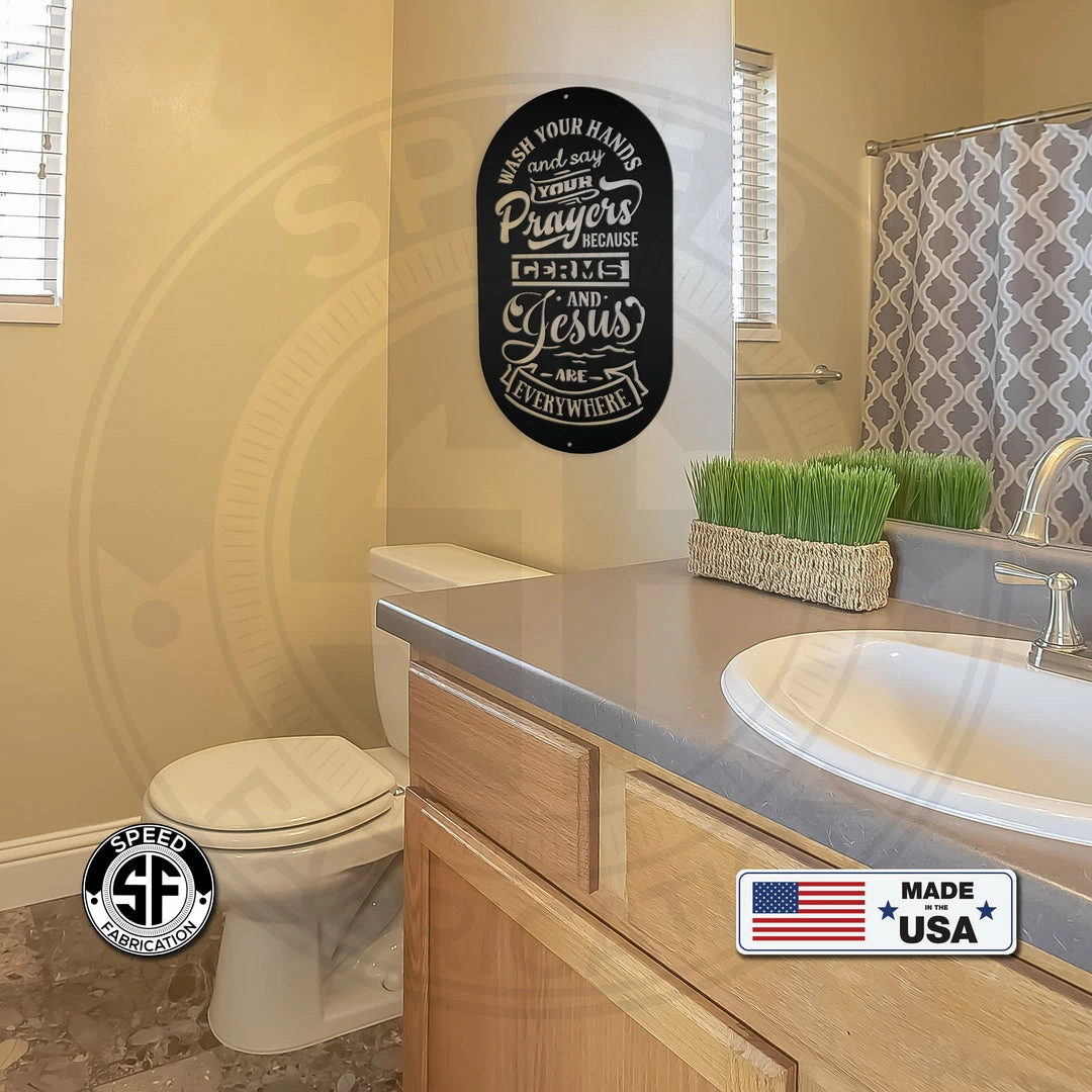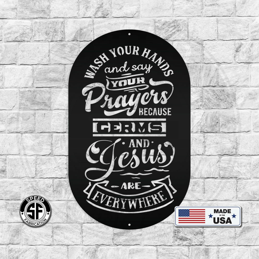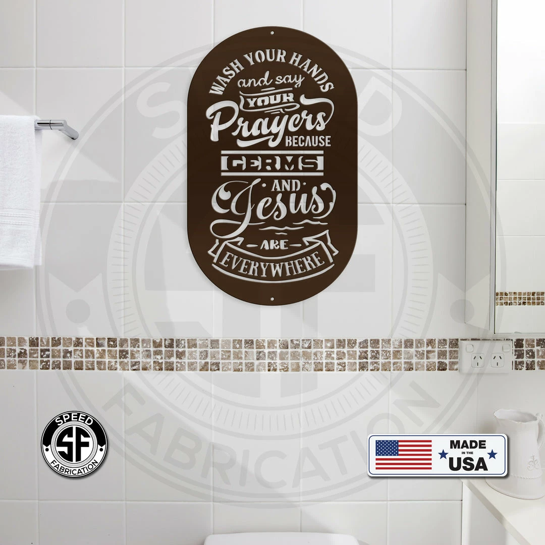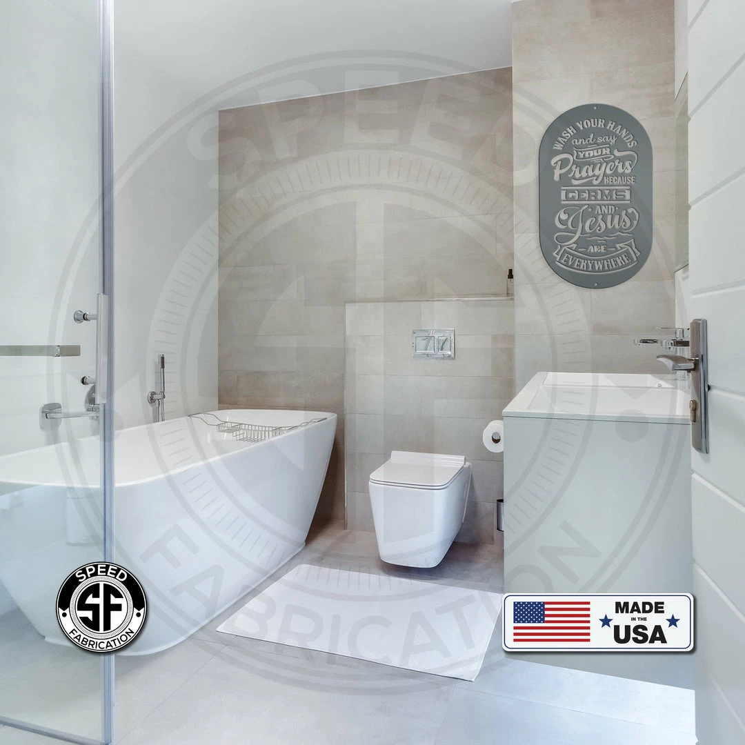 This Wash Your Hands and Say Your Prayers Because Germs and Jesus are Everywhere Bathroom Metal Sign is the perfect dΓ©cor for any bathroom. Sizing is for the height of the sign. Our 12″ through 28″ signs are made from 16 gauge steel, 30″ through 36″ signs are made from 14 gauge steel with a powder coated finish for a long lasting sign indoors or outdoors.