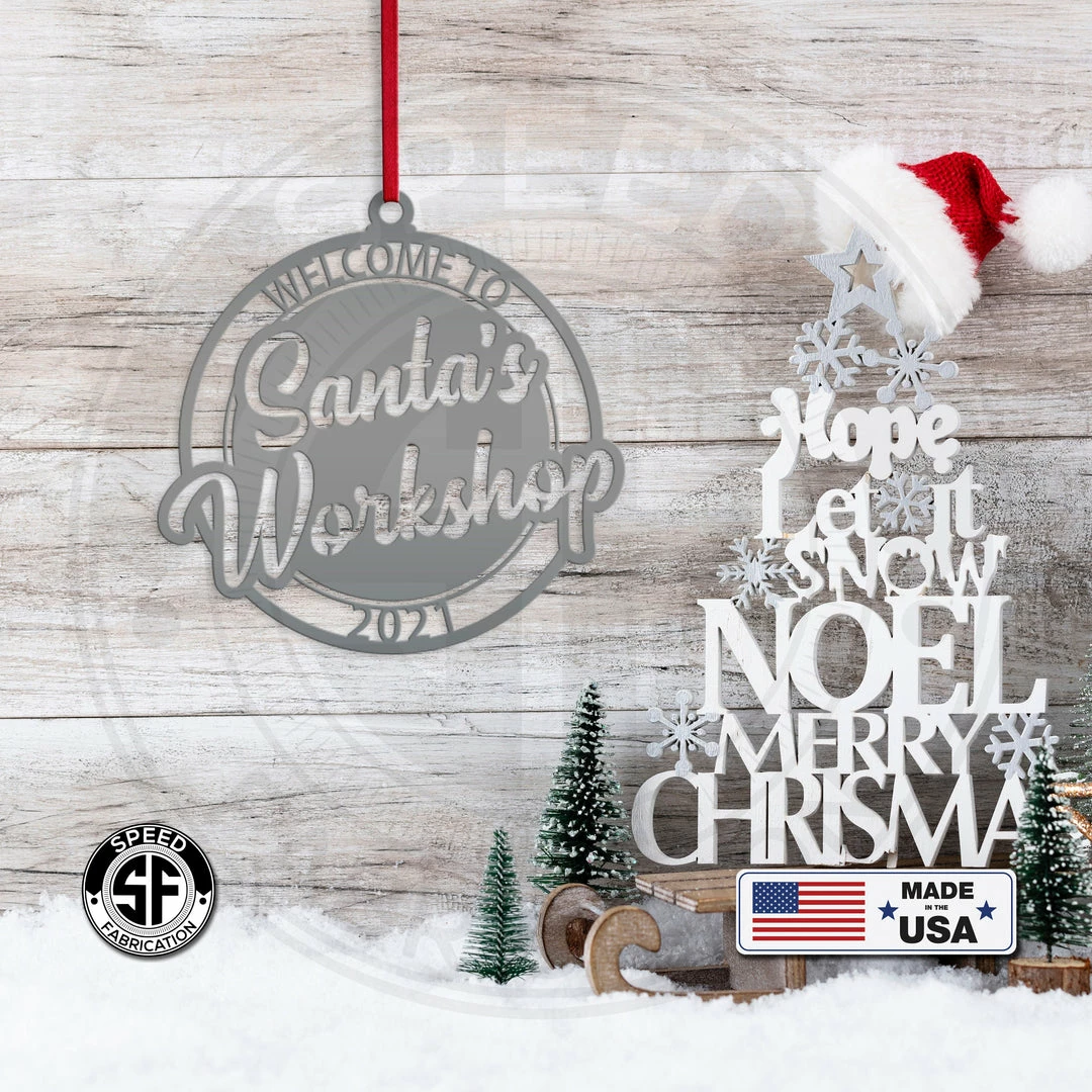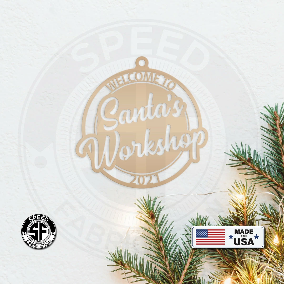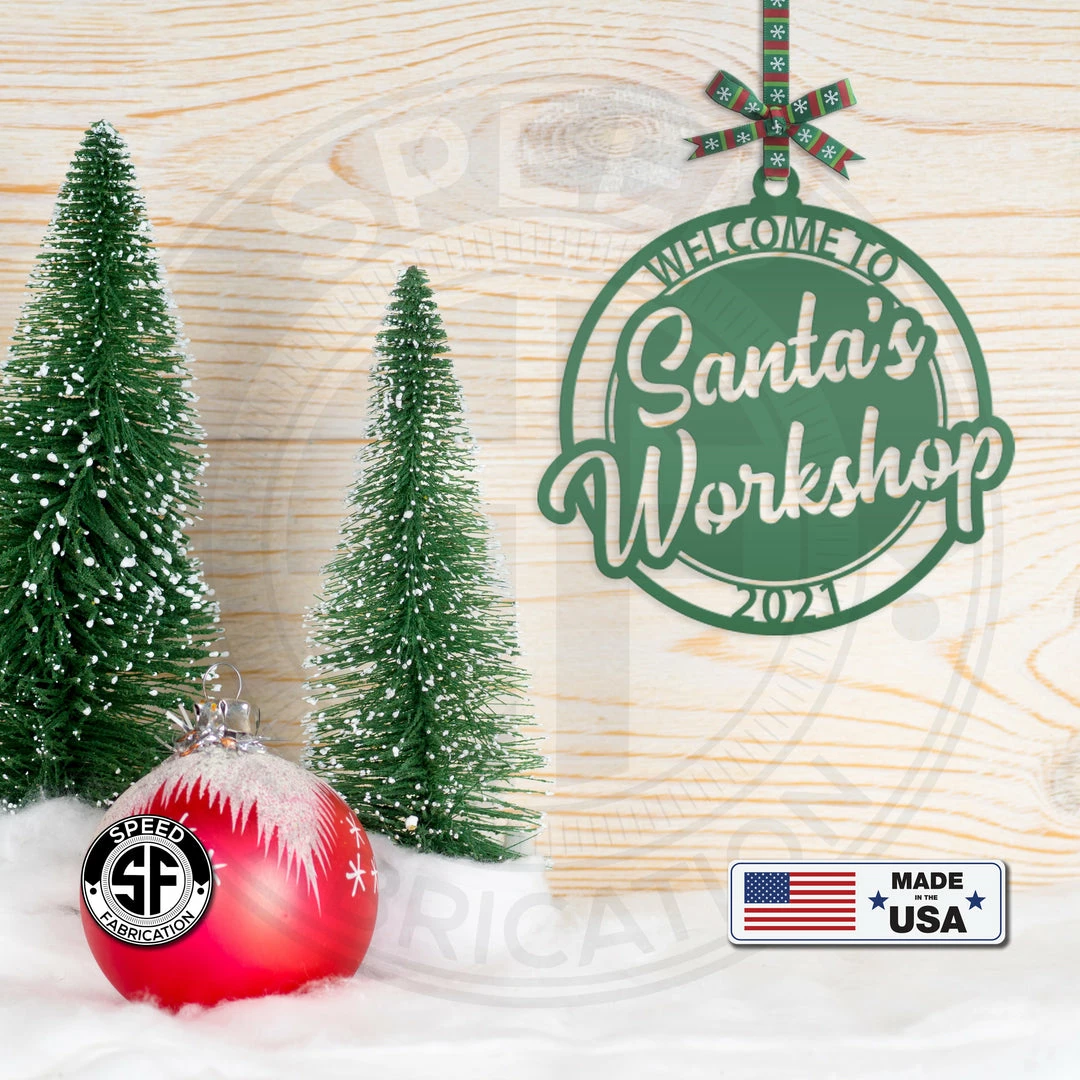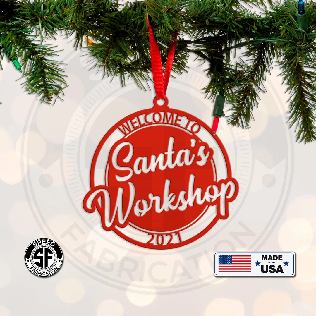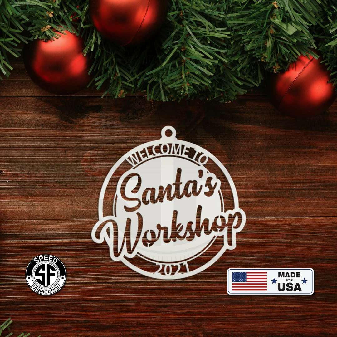 This Welcome to Santa’s Workshop Dated Christmas Ornament is the perfect way to deck your halls for the holidays. Makes a perfect gift or stocking stuffer. Made steel with a powder coated finish of your choice or left in a bare metal finish that will rust when exposed to humidity. This ornament is dated with the current year, measures 4″ wide and does NOT include a ribbon or cord for hanging.